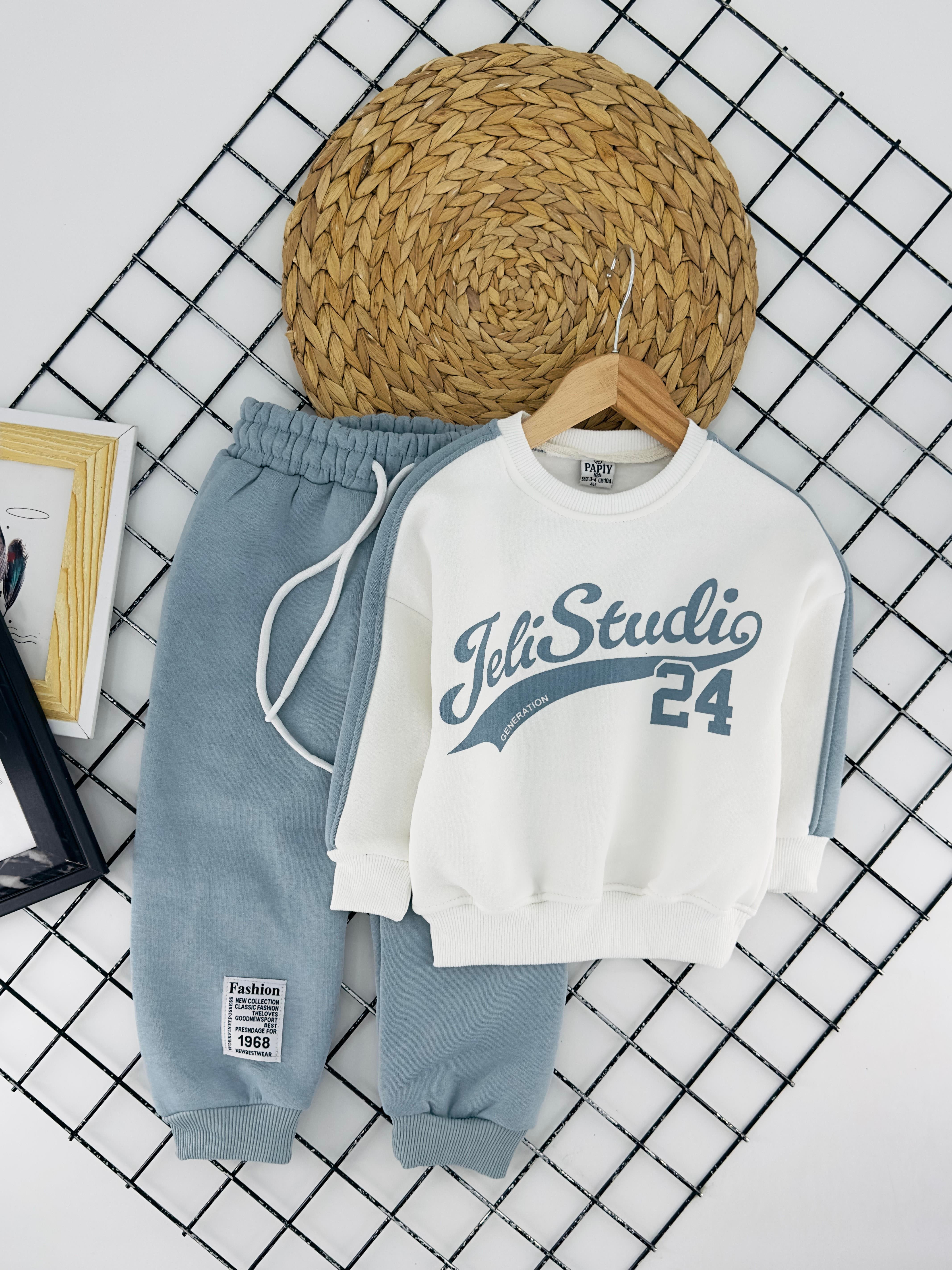 0324-1 Studiy Yazılı Erkek Çocuk Üç İplik şardonlu Takım-MAVİ