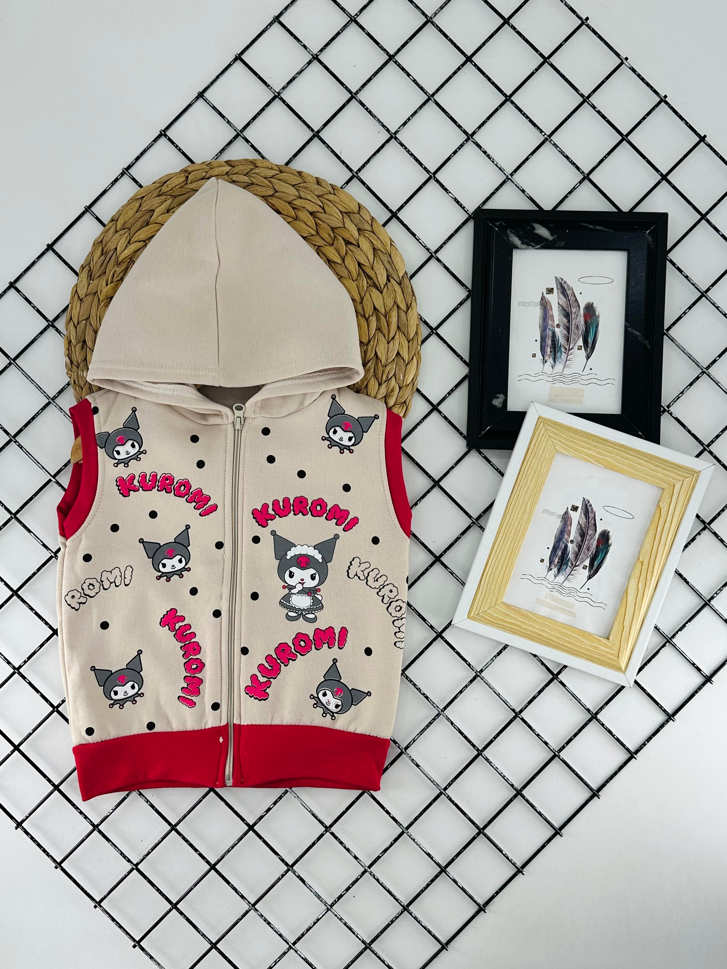 0350-1 Krm Baskılı Kız Çocuk Üç İplik Şardonlu Yelek-BEJ