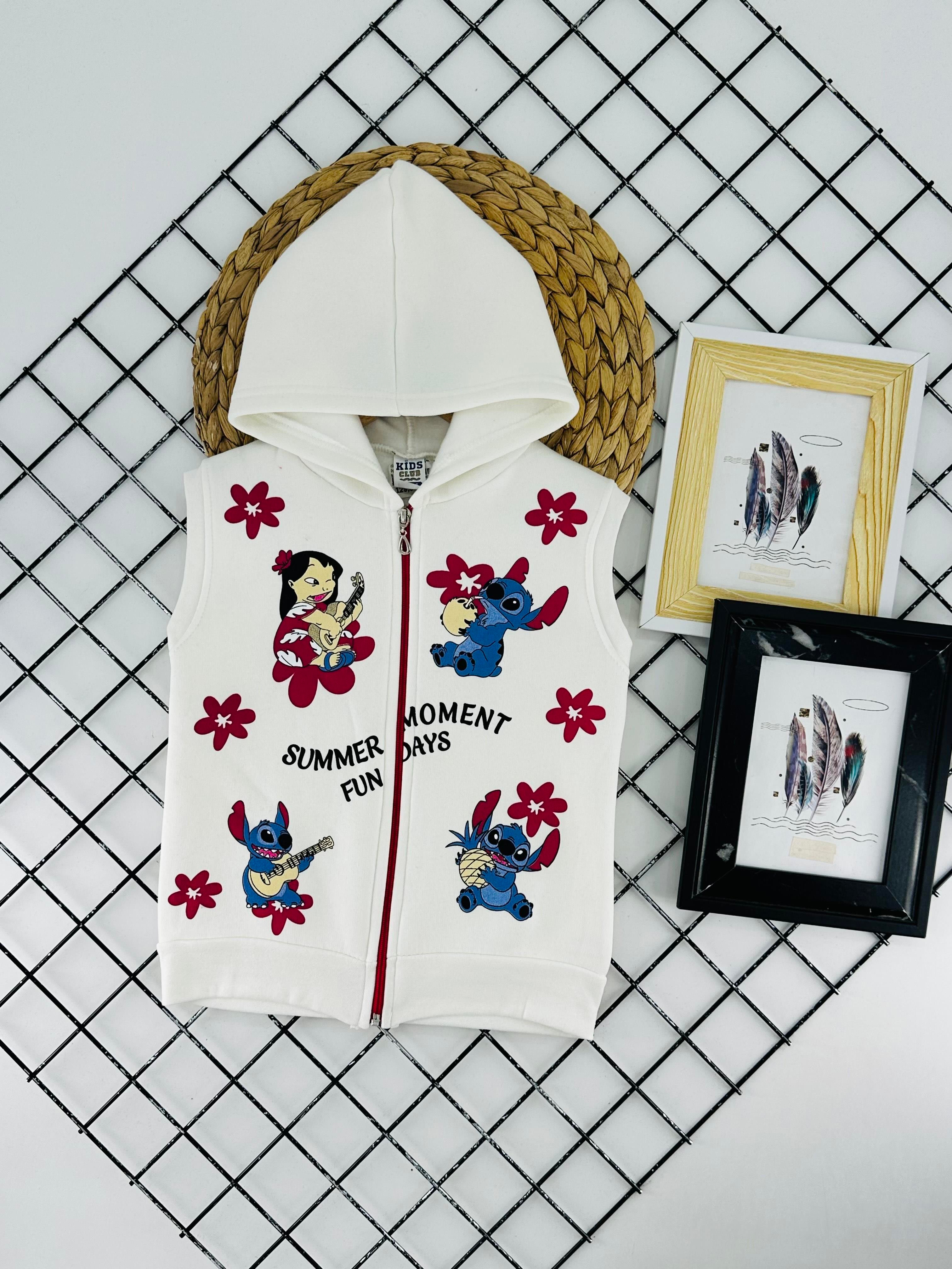 0350-2 Stck Baskılı Kız Çocuk Üç İplik Şardonlu Yelek-BEYAZ