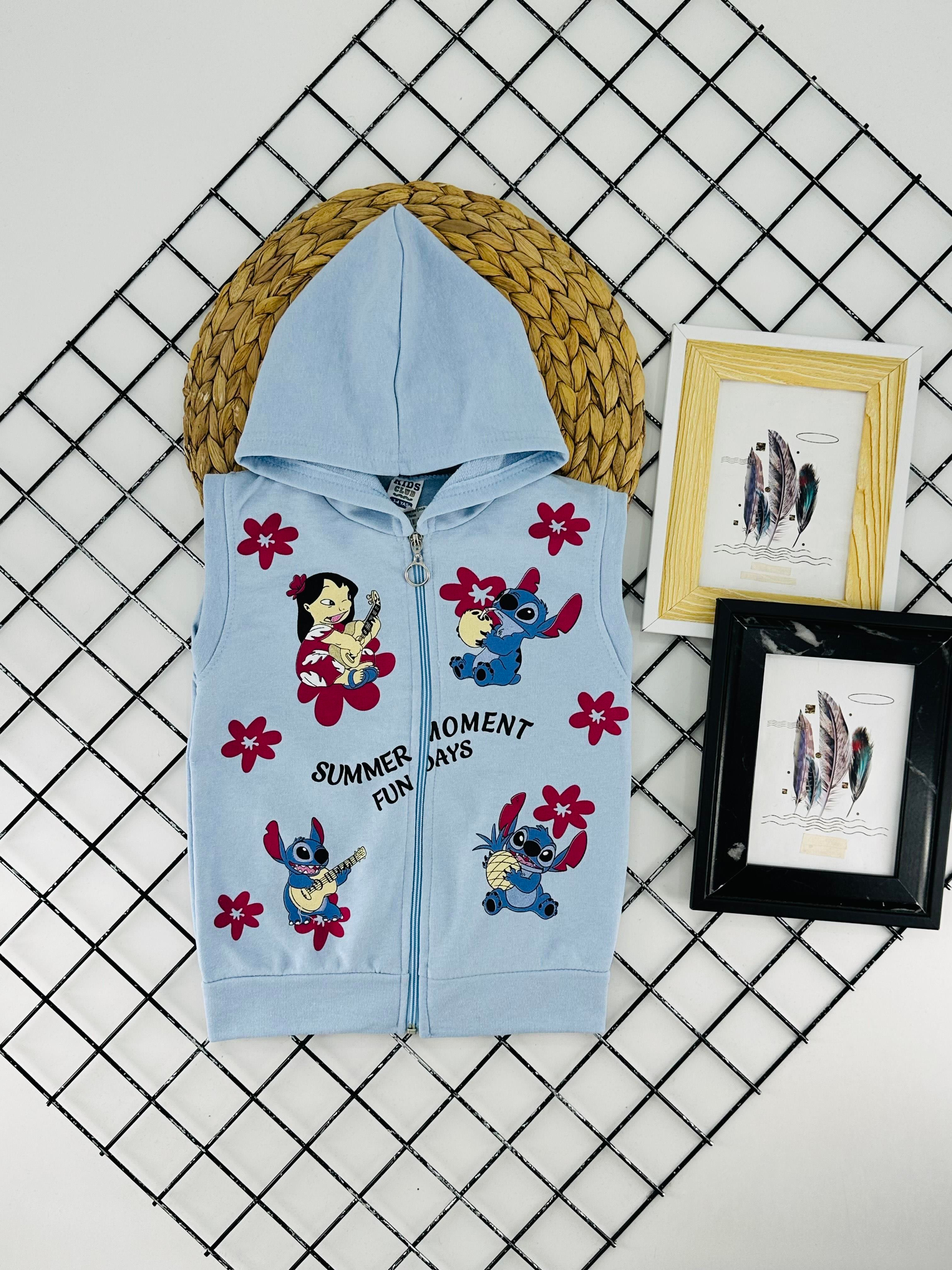 0350-2 Stck Baskılı Kız Çocuk Üç İplik Şardonlu Yelek-BUZ MAVİ