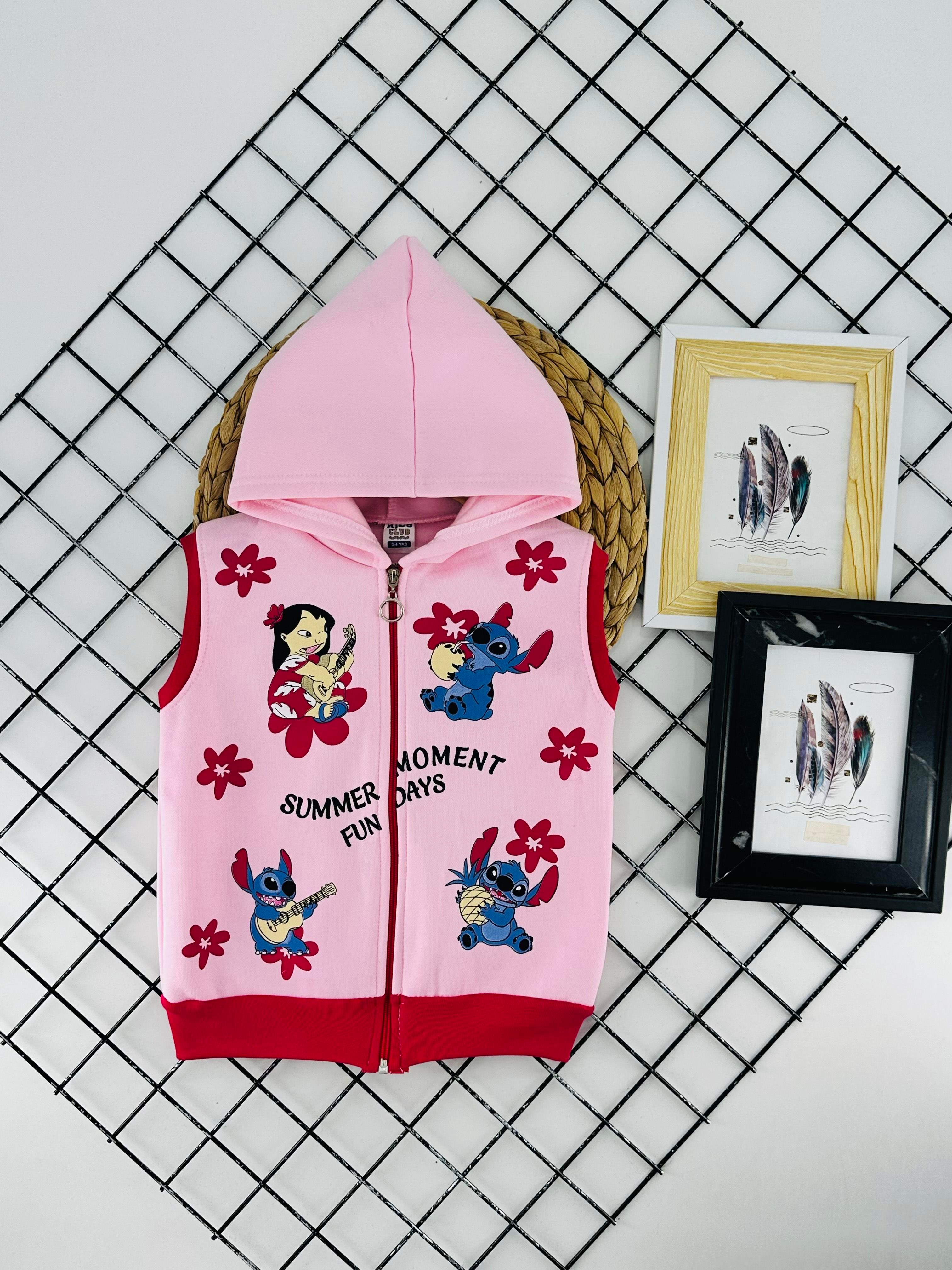 0350-2 Stck Baskılı Kız Çocuk Üç İplik Şardonlu Yelek-TOZ PEMBE