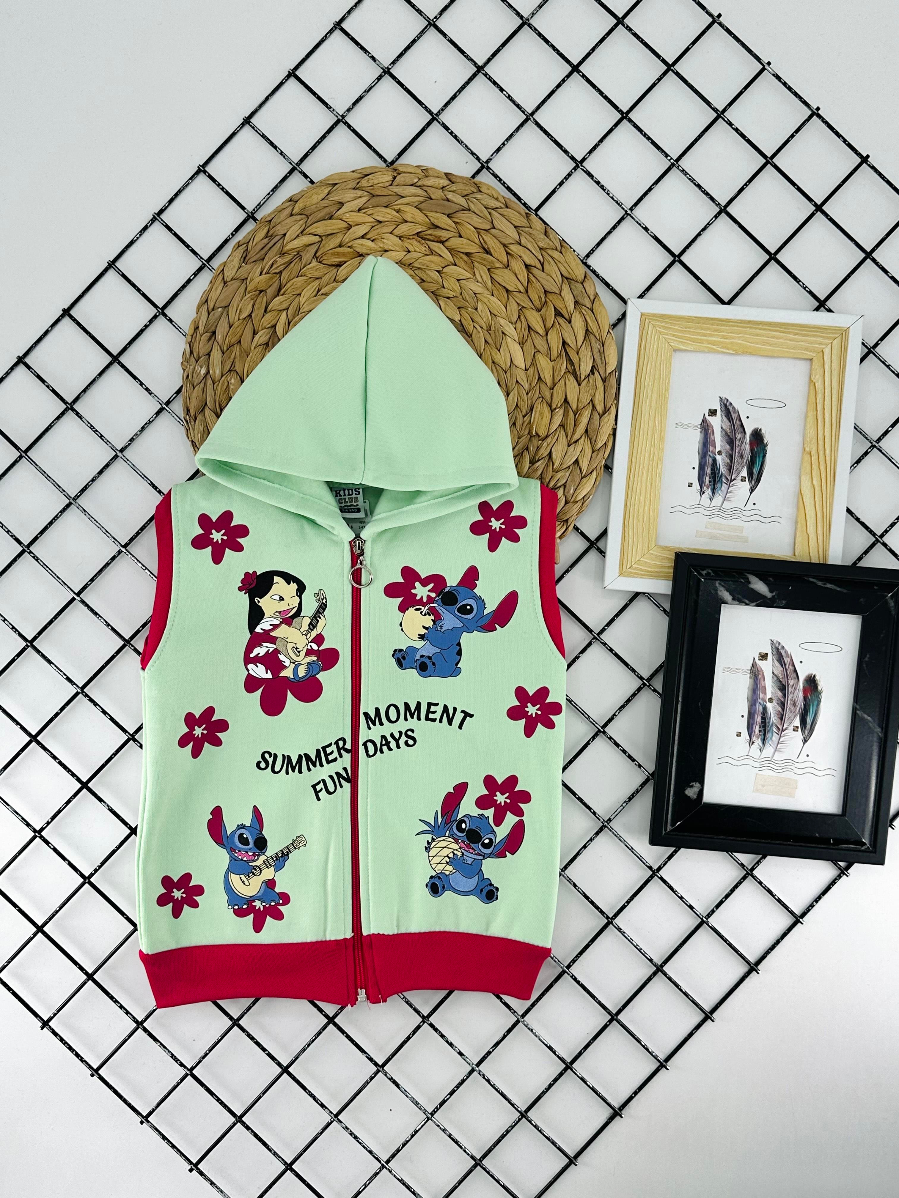 0350-2 Stck Baskılı Kız Çocuk Üç İplik Şardonlu Yelek-YEŞİL