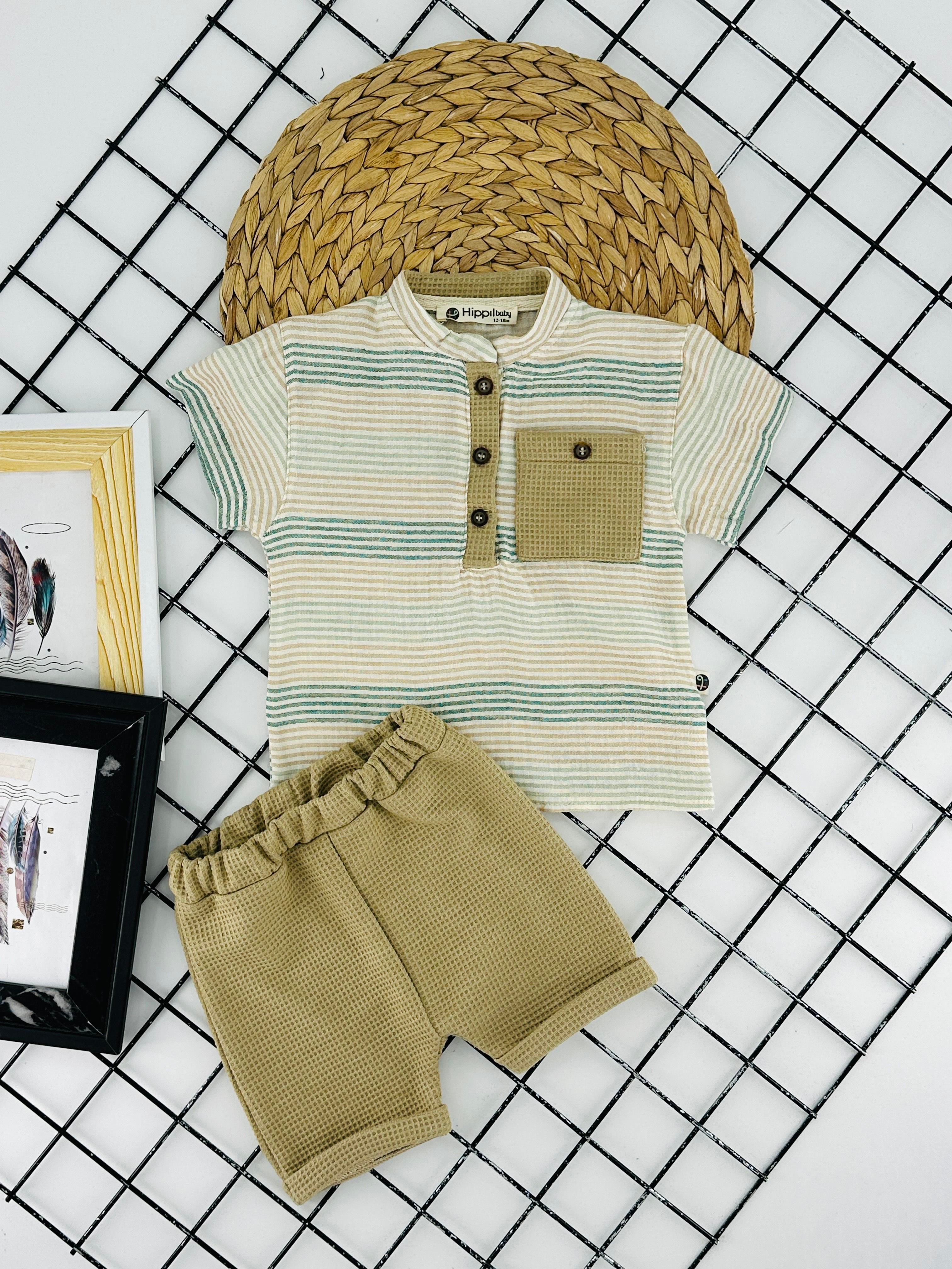 0529 Çizgili Önü Düğmeli Erkek Bebek Şortlu Takım-YEŞİL