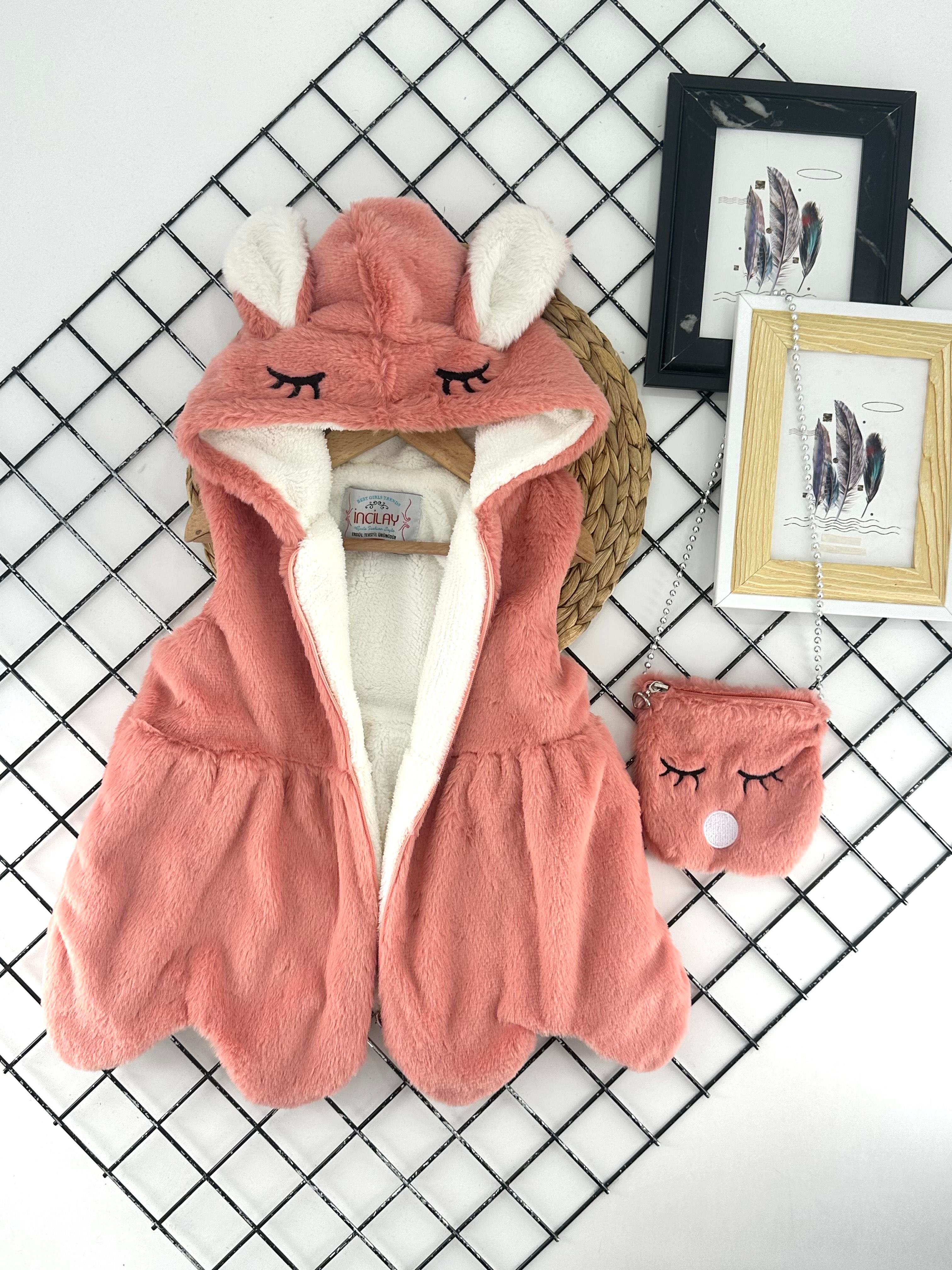 0702 Şapkası Tavşanlı Çantalı Kız Çocuk Kürk Yelek-SOMON