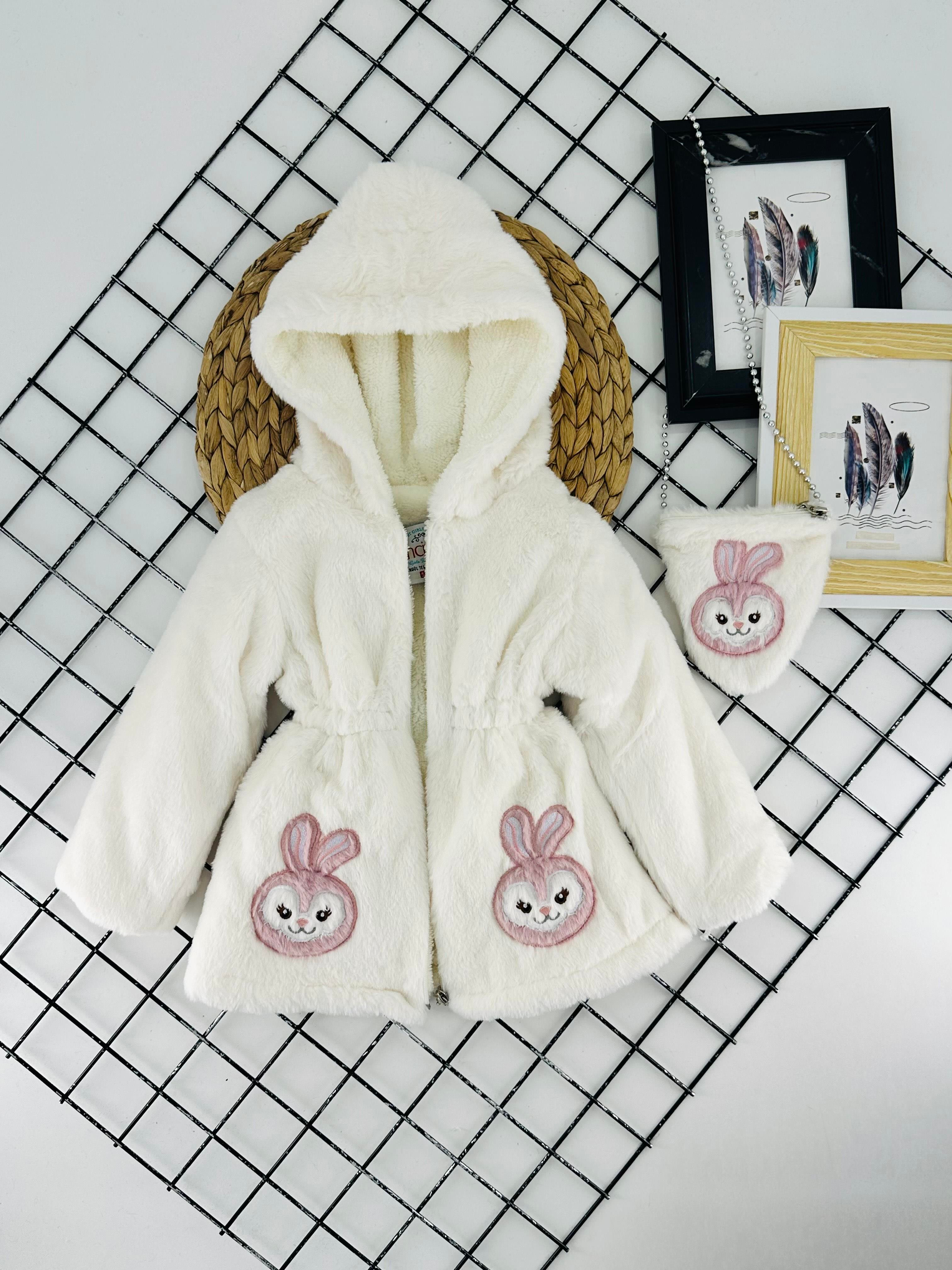 0705-2 Tavşan Nakışlı Çantalı Kız Çocuk Kürk Mont-SOMON 0705-2 Tavşan Nakışlı Çantalı Kız Çocuk Kürk Mont-KREM