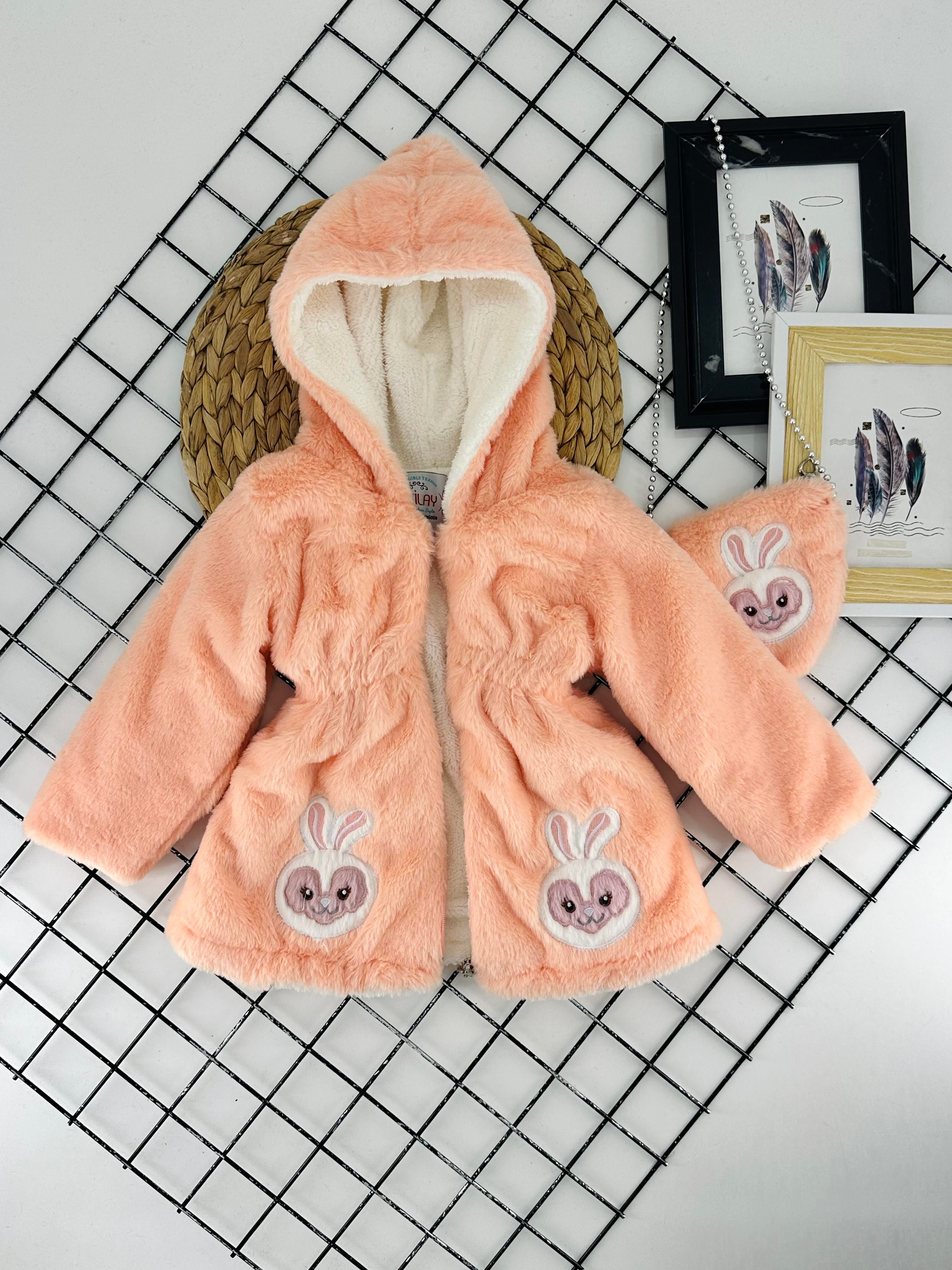 0705-2 Tavşan Nakışlı Çantalı Kız Çocuk Kürk Mont-SOMON
