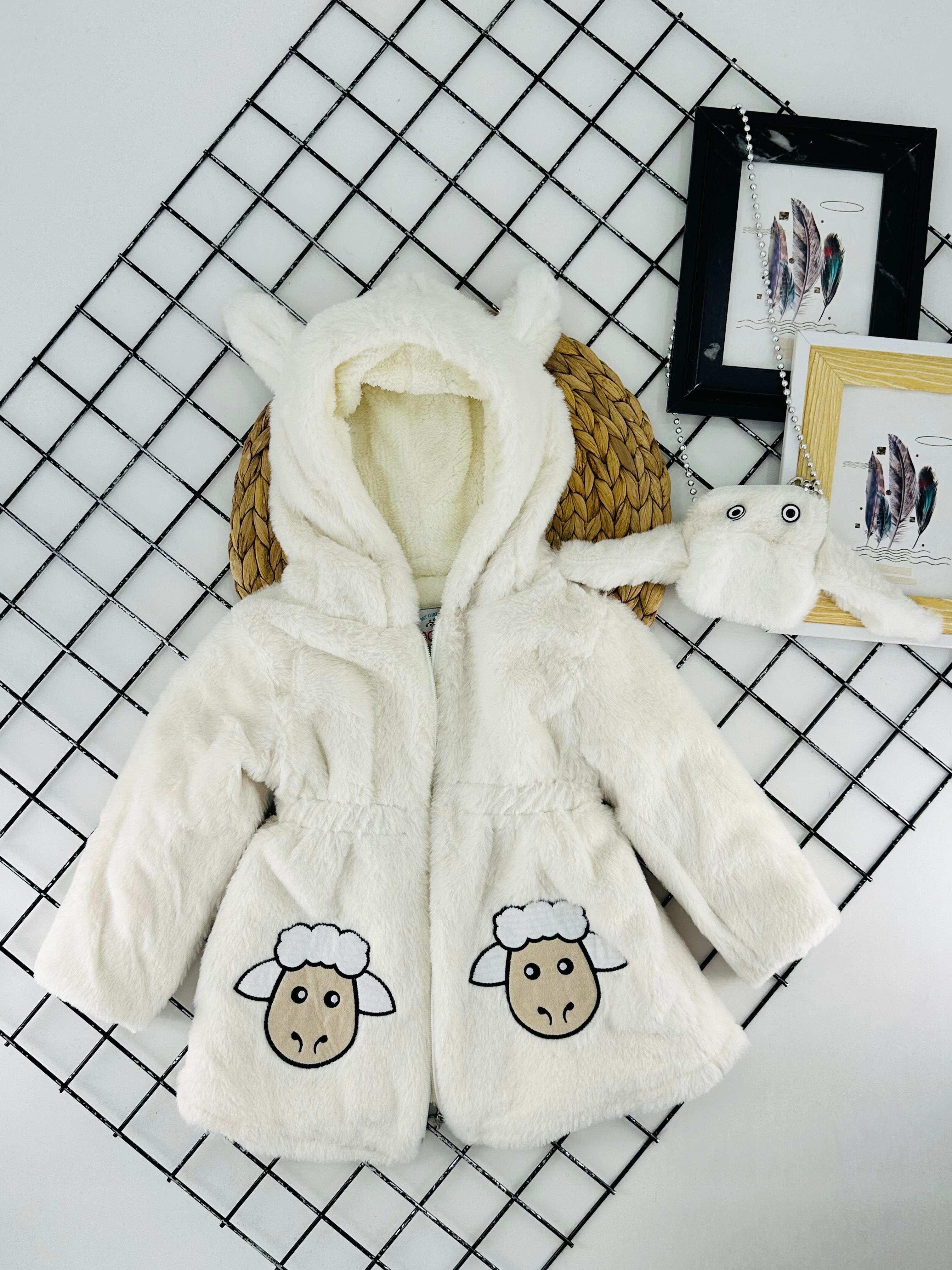 0709 Kuzu Nakışlı Çantalı Kız Çocuk Kürk Mont-SOMON 0709 Kuzu Nakışlı Çantalı Kız Çocuk Kürk Mont-KREM