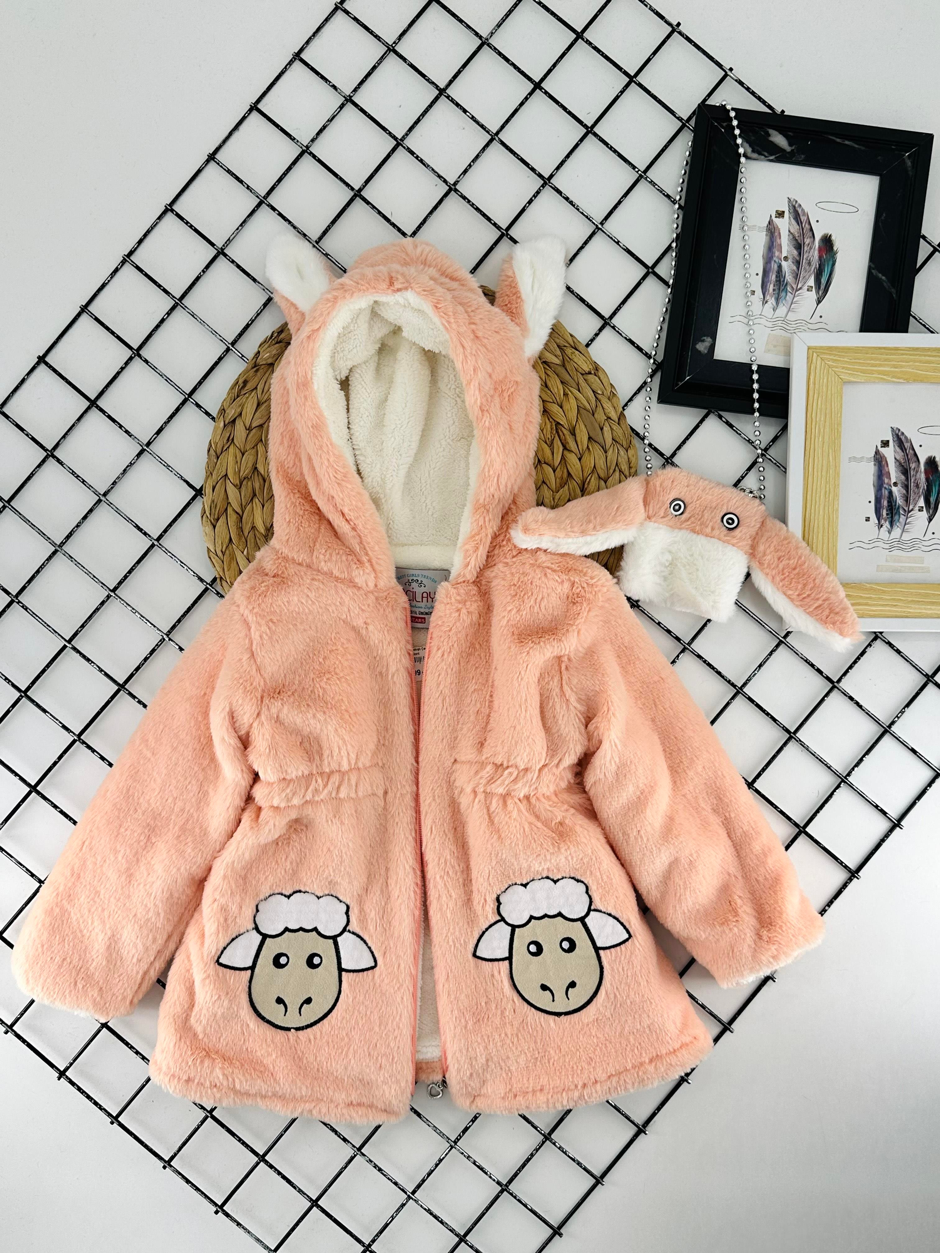 0709 Kuzu Nakışlı Çantalı Kız Çocuk Kürk Mont-SOMON