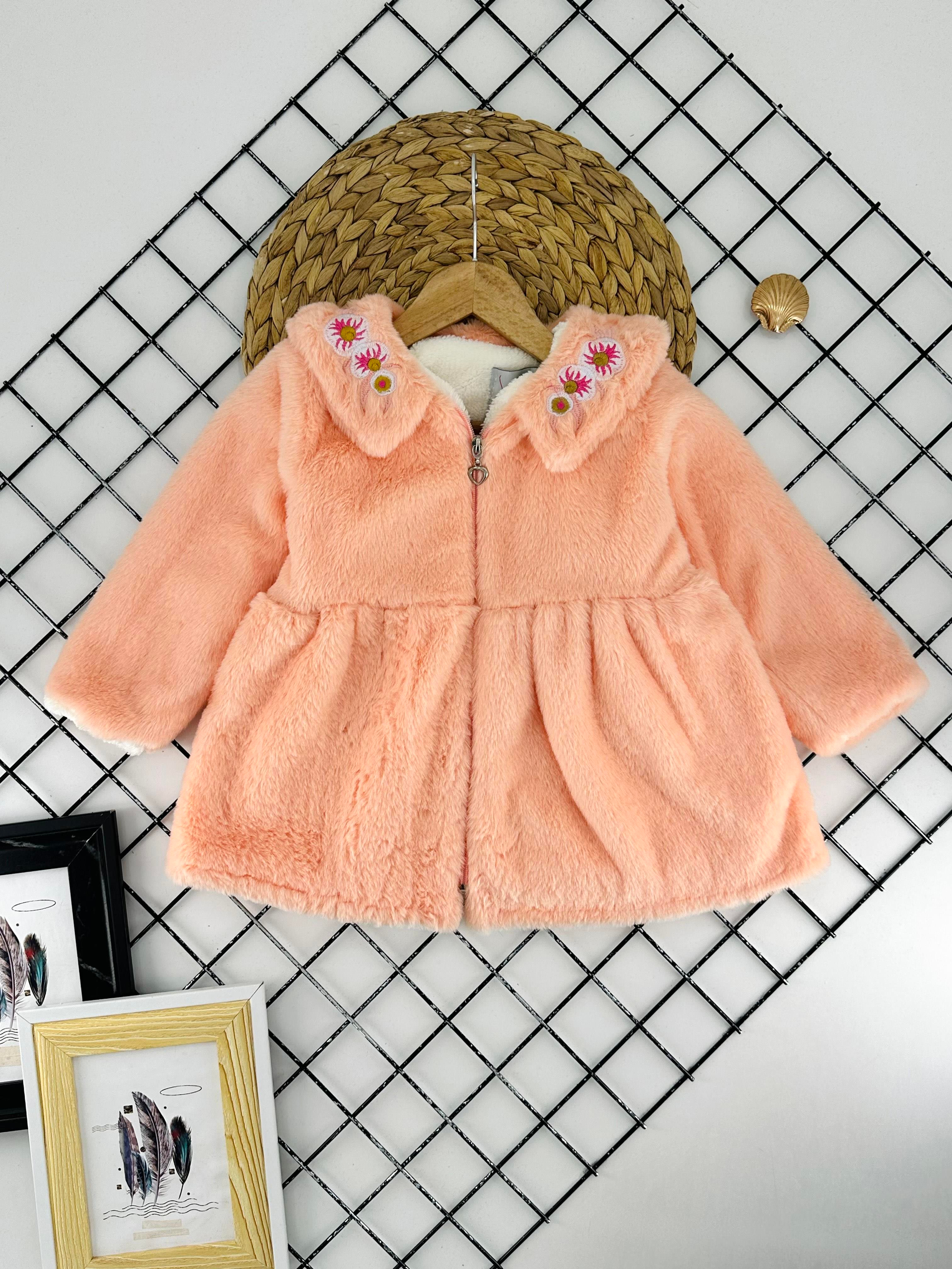 0711-1 Yakası Çiçek Nakışlı Kız Çocuk Kürk Mont-SOMON