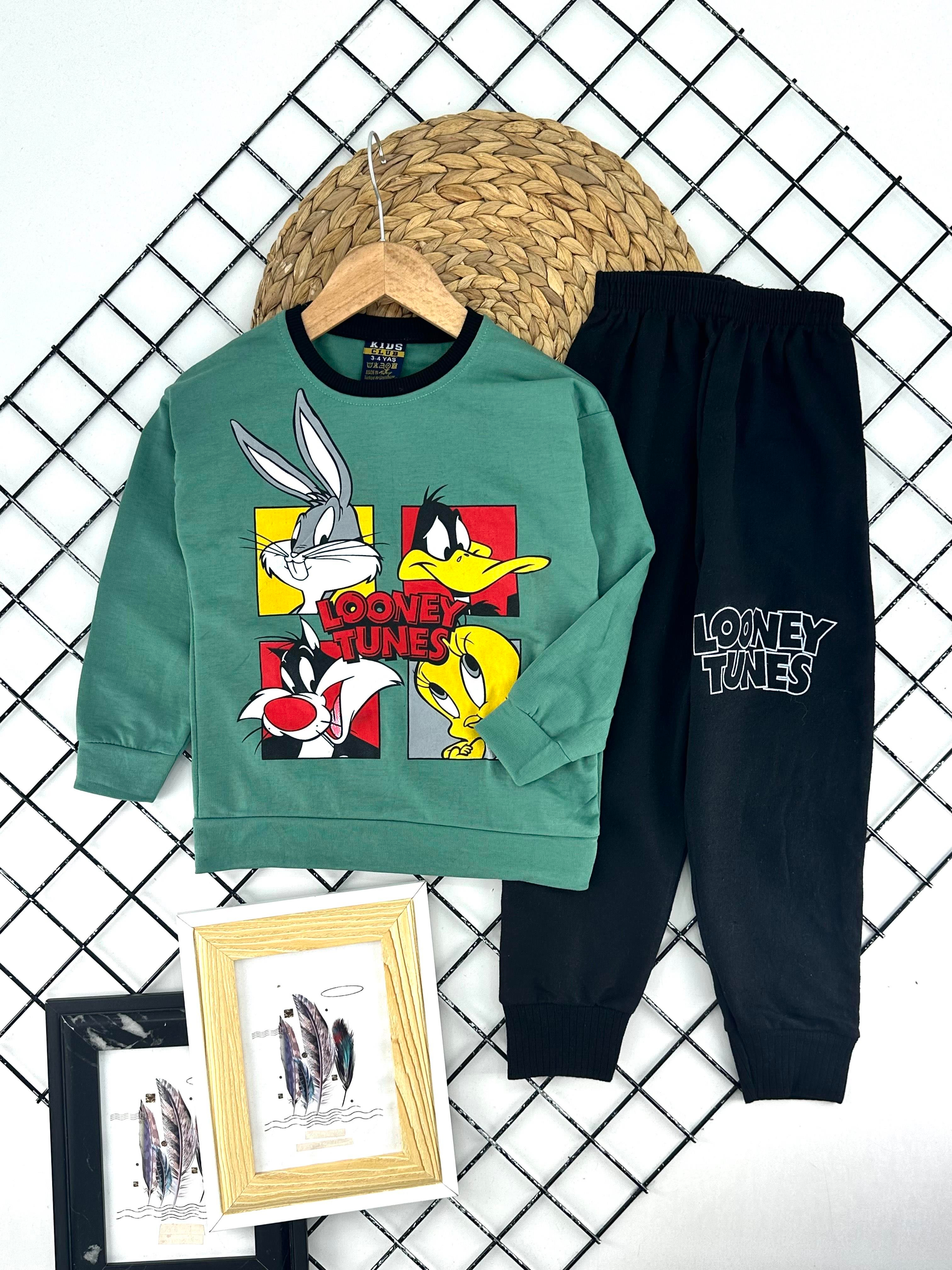 0794-2 Tavşan Ördek Baskılı İki İplik Penye Erkek Çocuk Takım-AÇIK YEŞİL