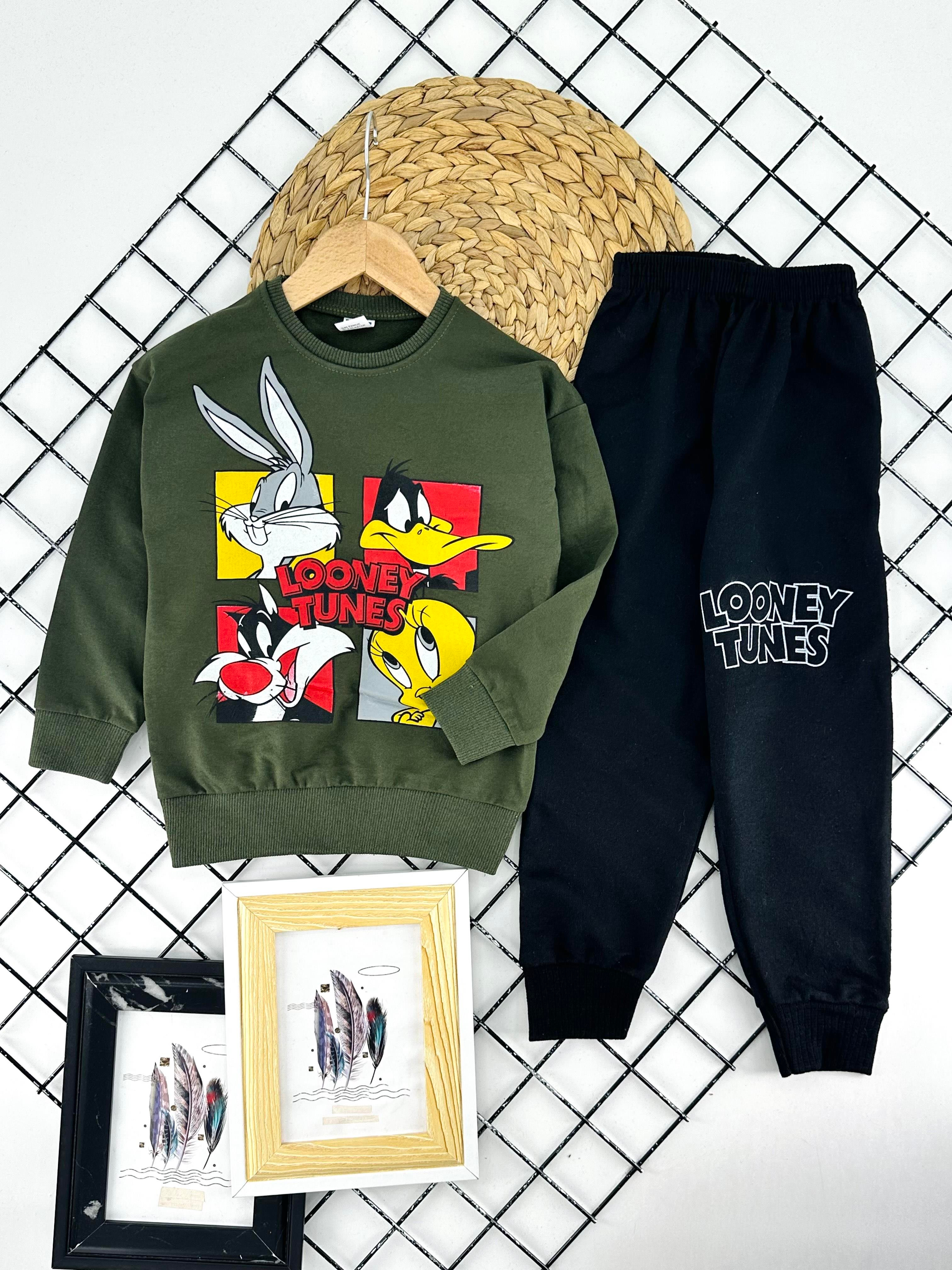 0794-2 Tavşan Öredek Baskılı İki İplik Penye Erkek Çocuk Takım-HAKİ YEŞİLİ
