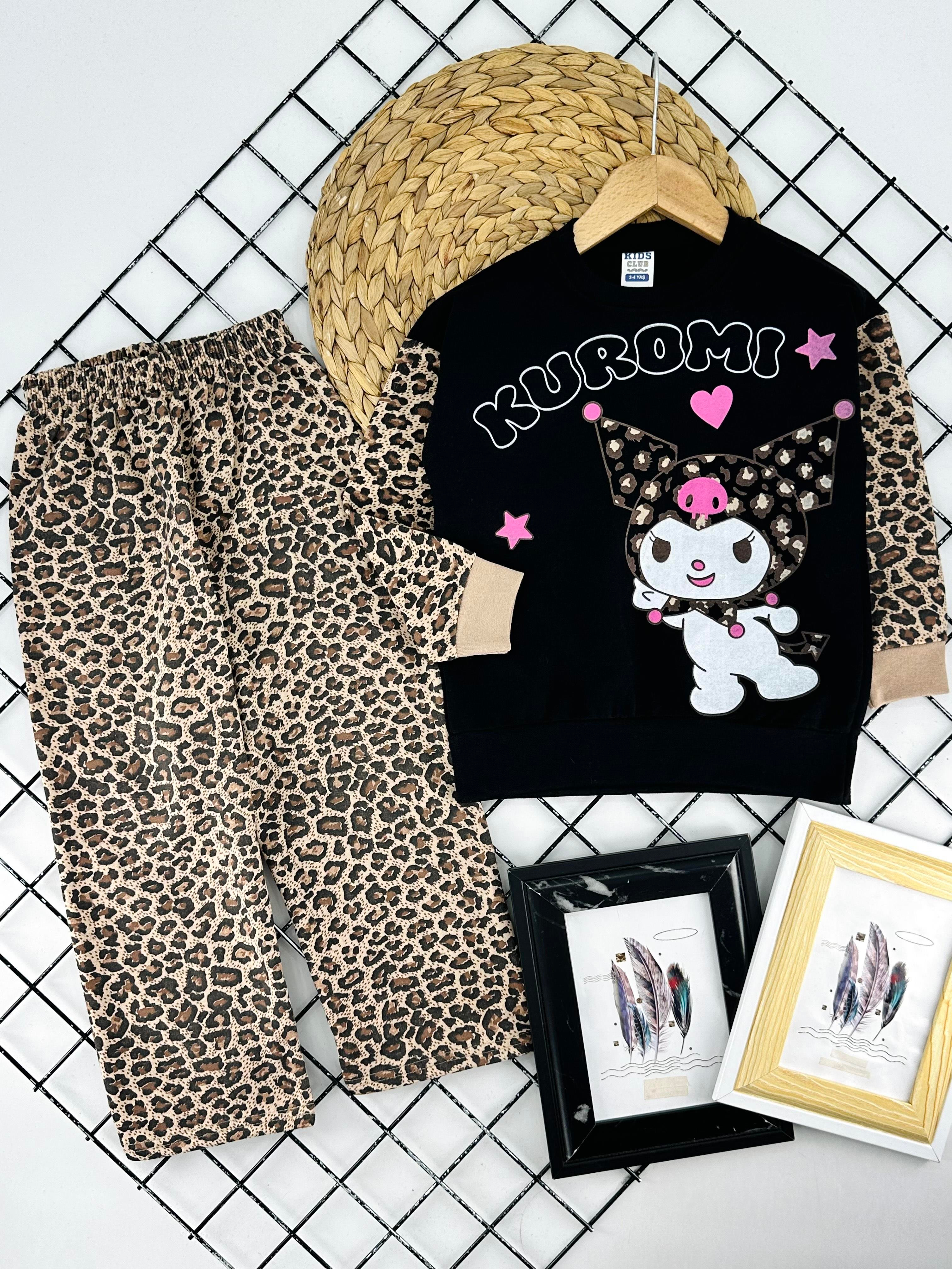 0799-2 Krm Baskılı Kalp Baskılı Kız Çocuk İki İplik Penye Takım-SİYAH