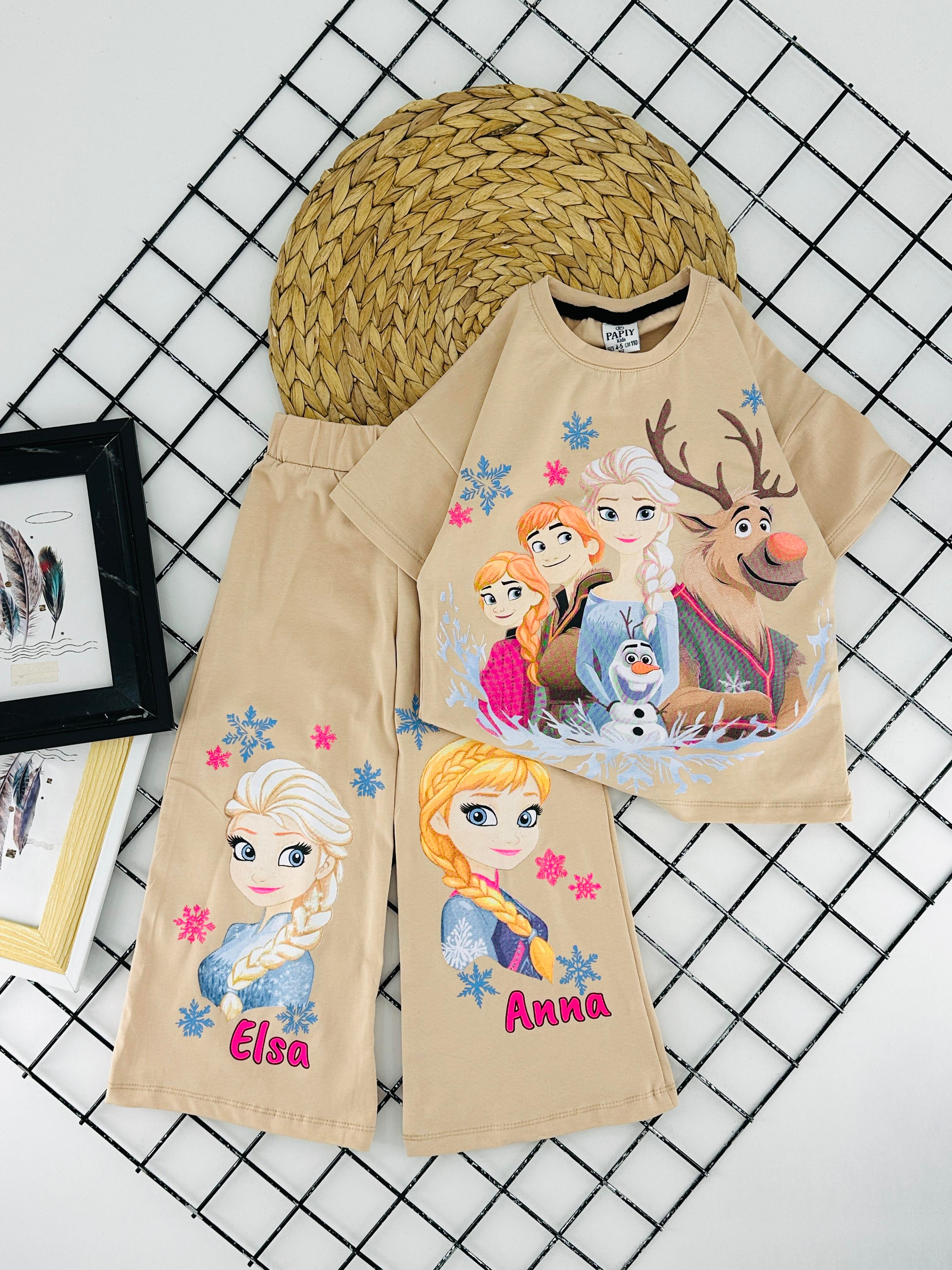 0800-2 Els Kartanesi Baskılı Kız Çocuk Penye Pantolonlu Takım-BEJ