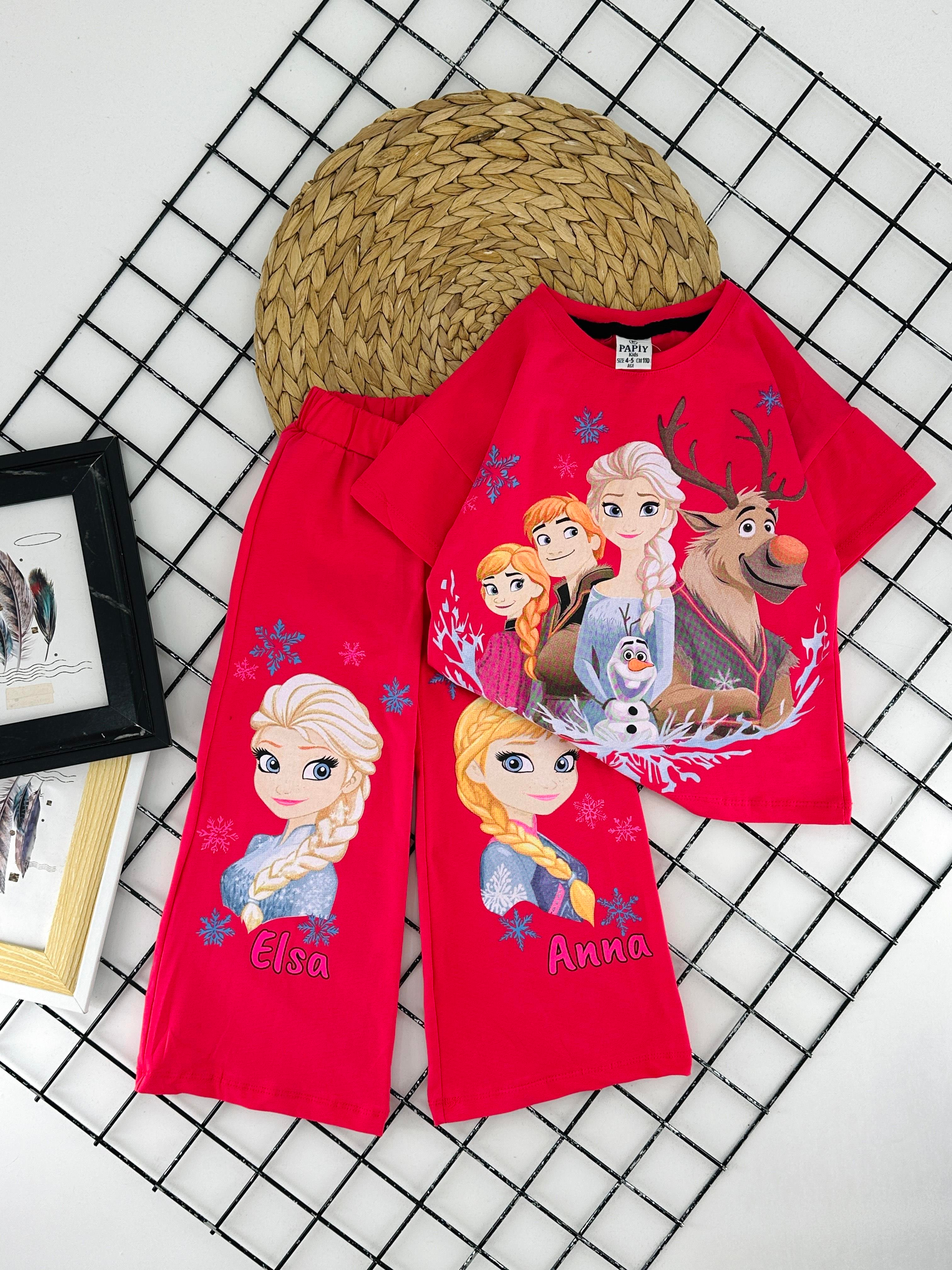 0800-2 Els Kartanesi Baskılı Kız Çocuk Penye Pantolonlu Takım-FUŞYA
