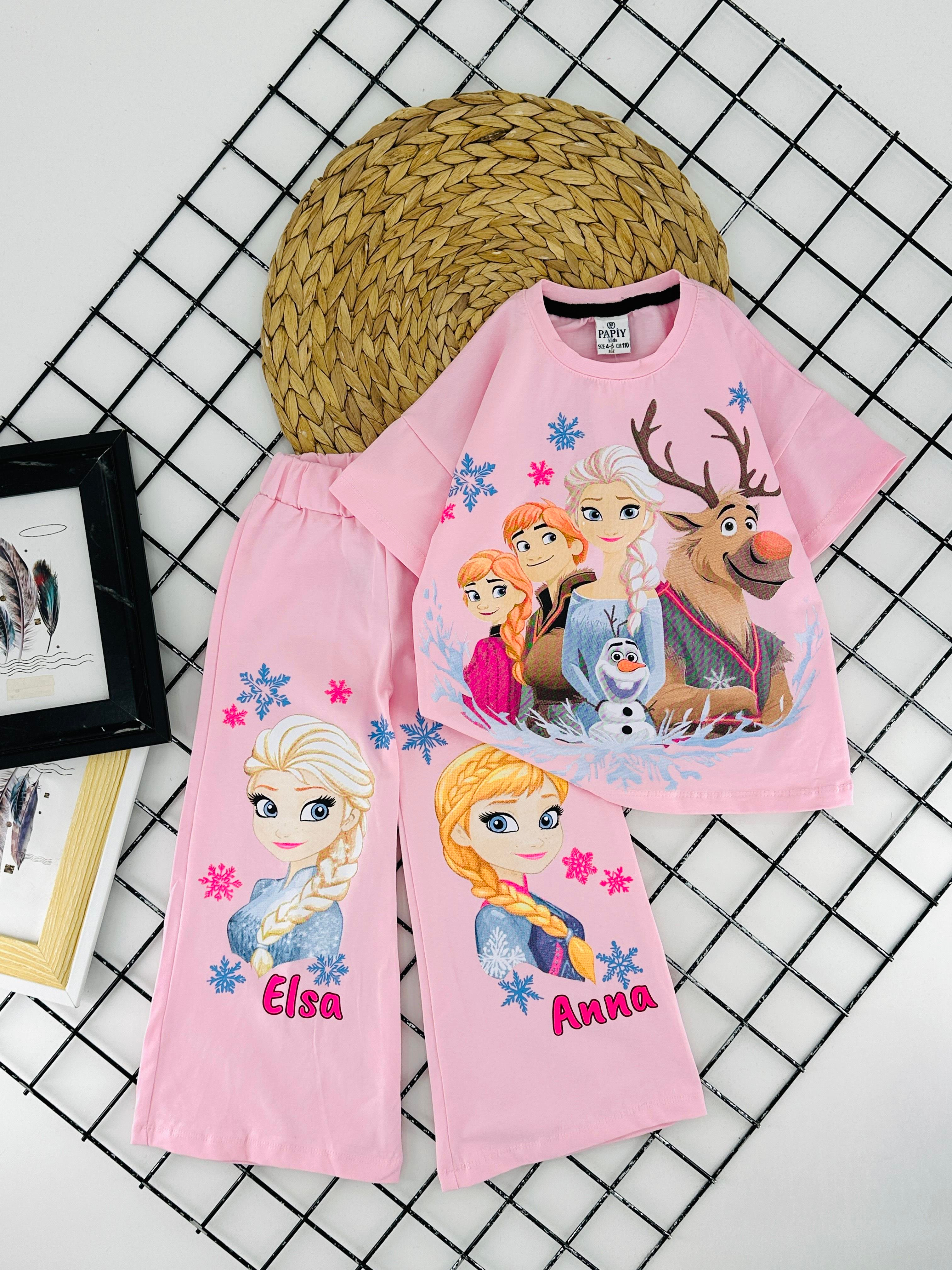0800-2 Els Kartanesi Baskılı Kız Çocuk Penye Pantolonlu Takım-PEMBE