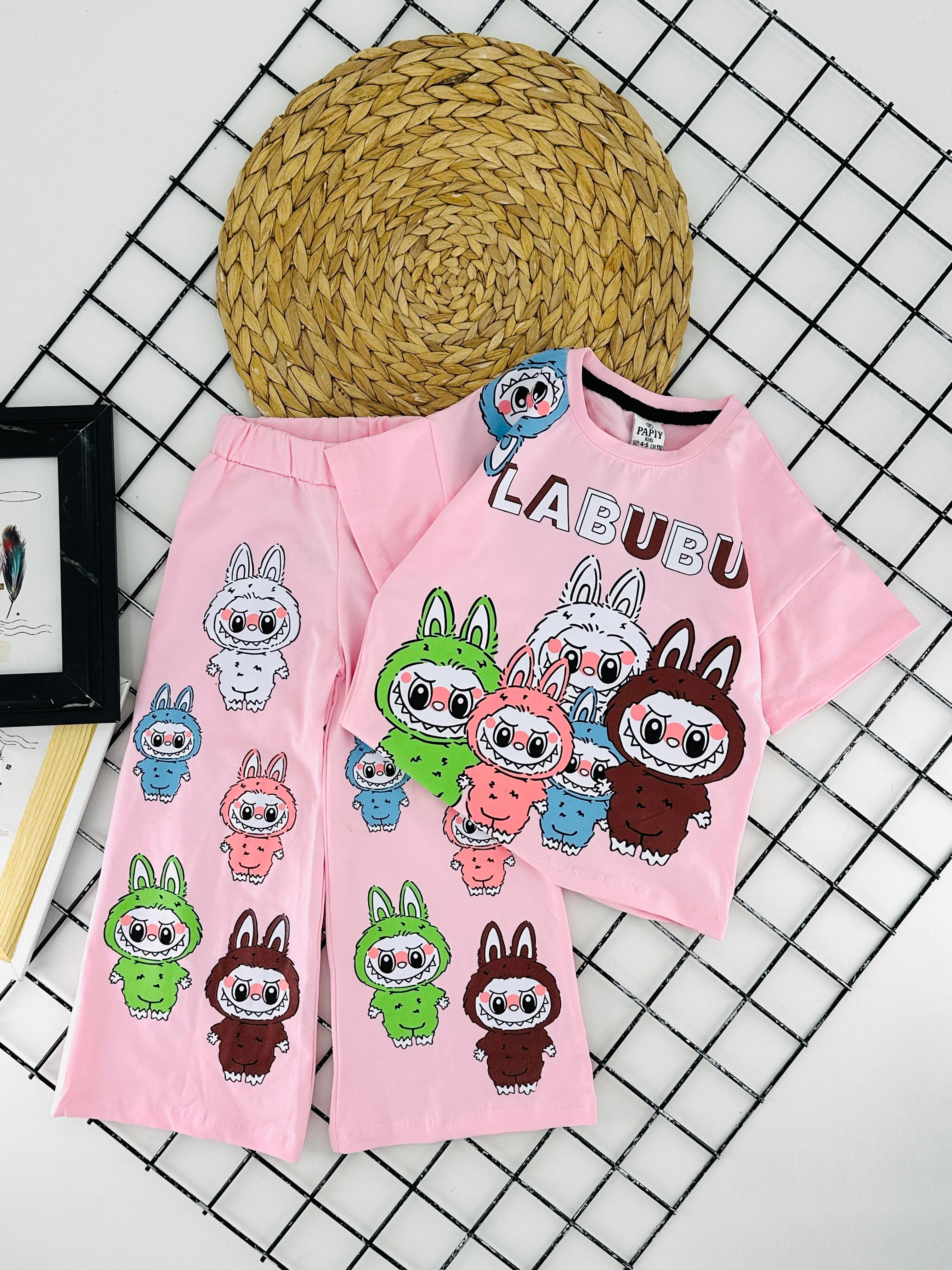 0800-3 Lbb  Baskılı Kız Çocuk Penye Pantolonlu Takım-PEMBE