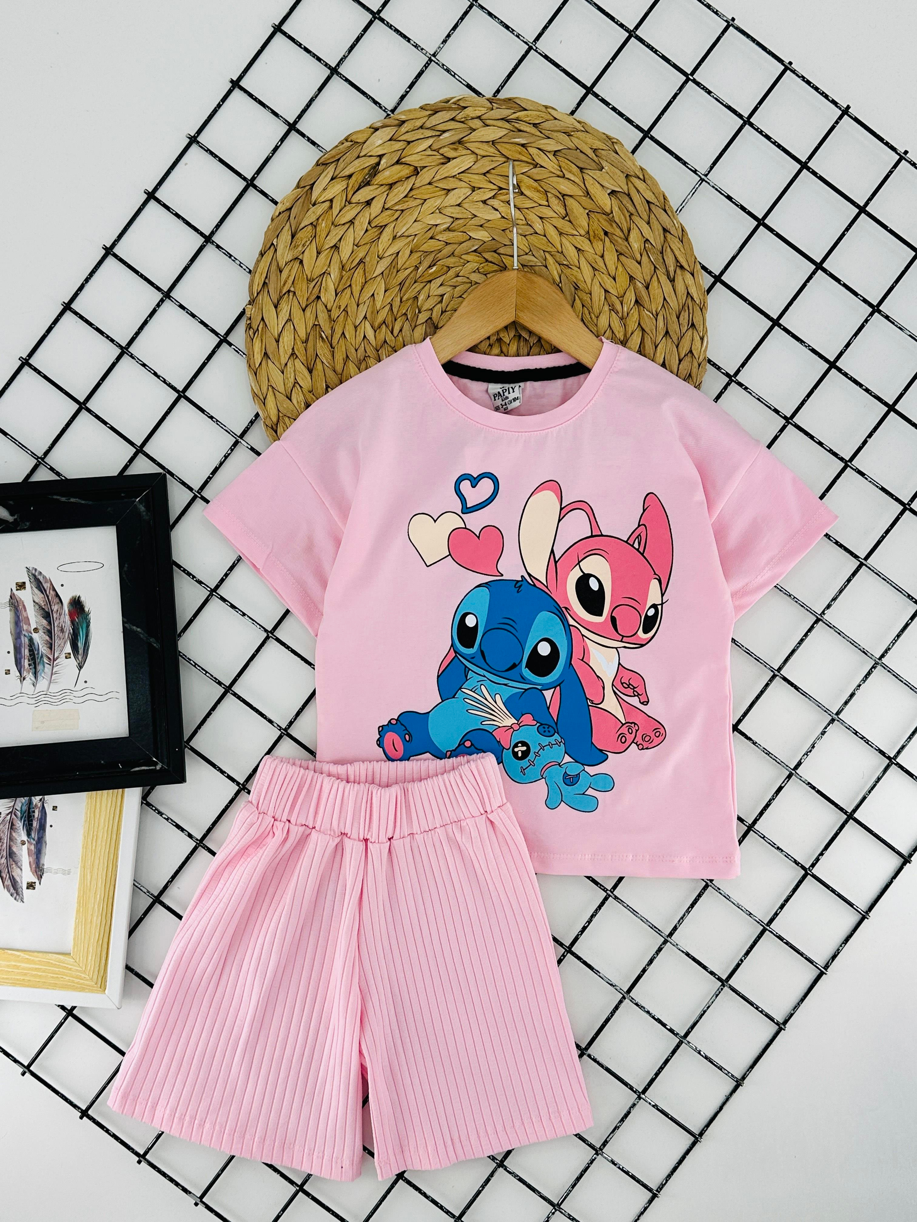 0900-2 Ll Stck Baskılı Kız Çocuk Fitilli Kumaş Şortlu Penye Takım-PEMBE
