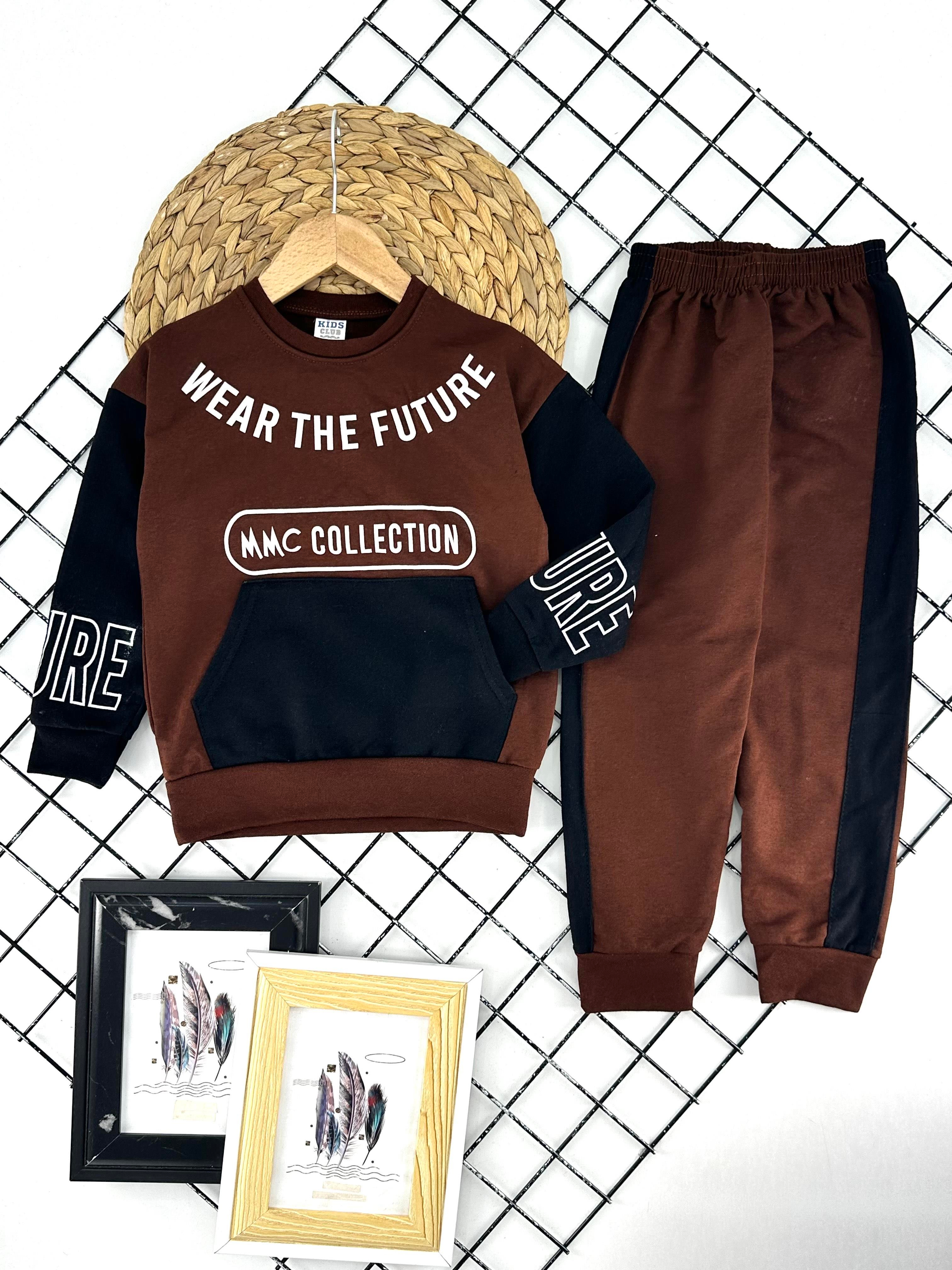 0929 Wear The Yazılı Erkek Çocuk Penye İki İplik Takım-KAHVE