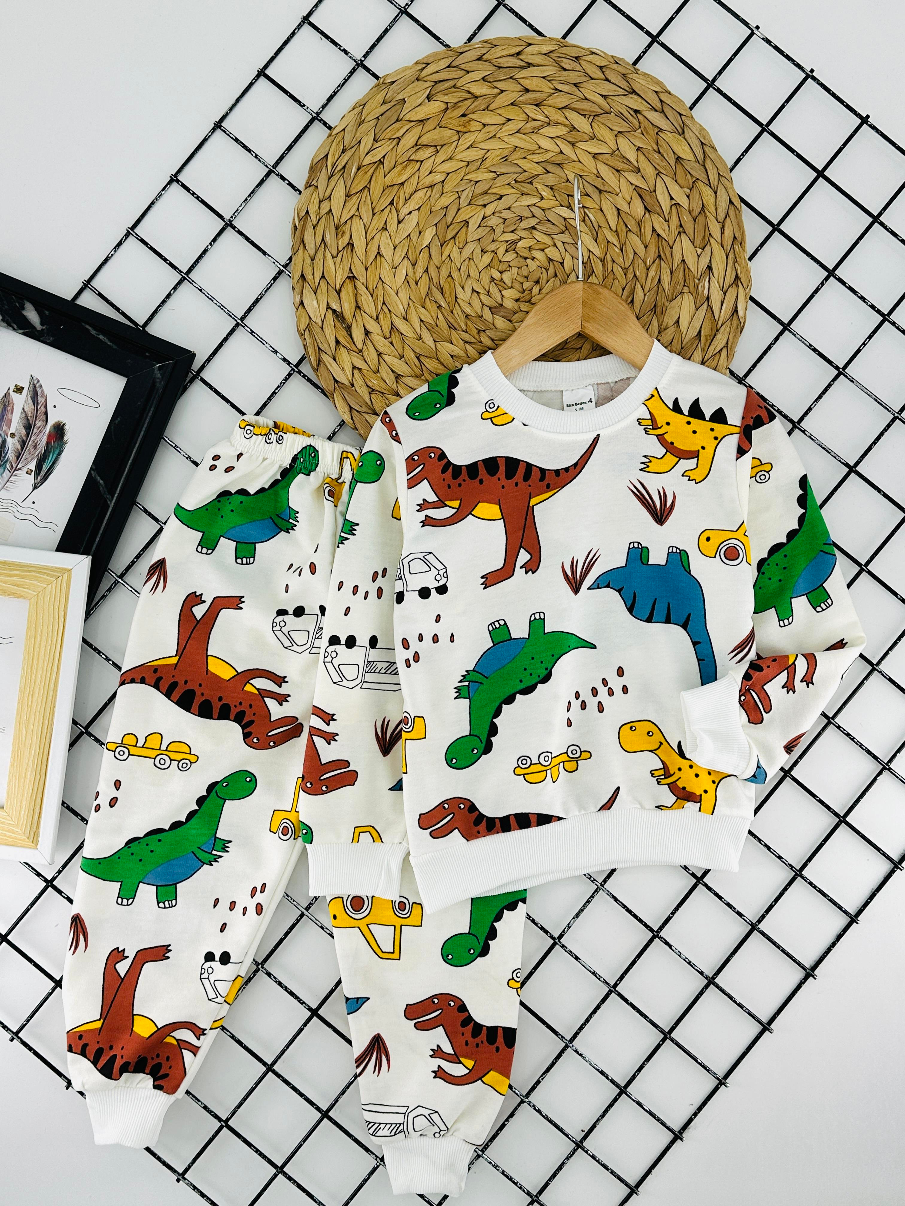 1000-11 Dinozor Baskılı Erkek Çocuk Penye Pijama Takımı-KREM