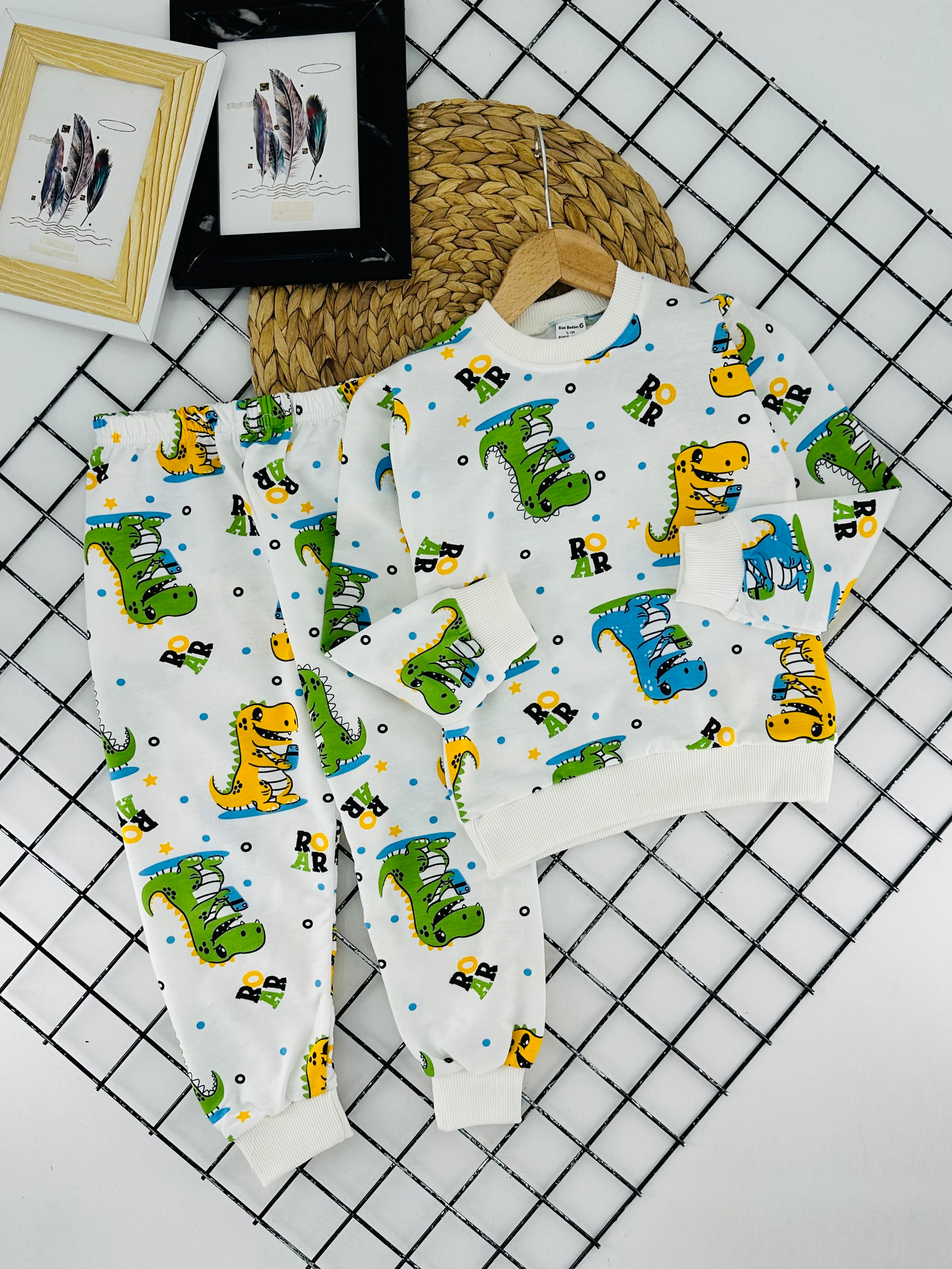 1000-12 Roar Dinozor Yazılı Erkek Çocuk Penye Pijama Takımı-KREM