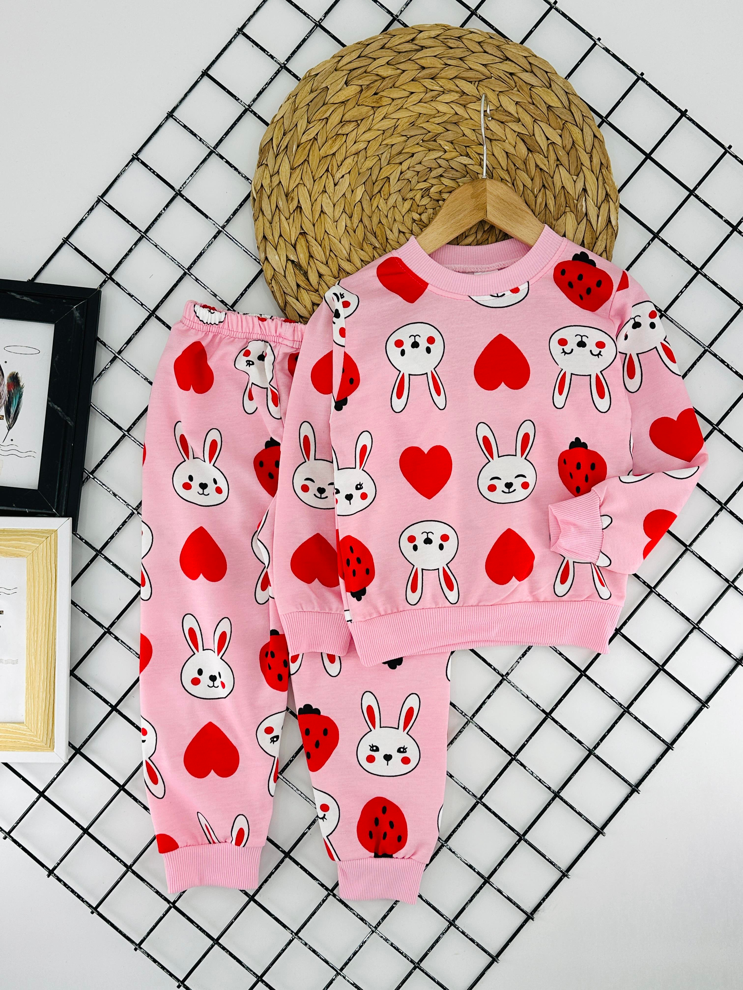 1000-28 Tavşan Çilek Baskılı Kız Çocuk Penye Pijama Takımı-PEMBE
