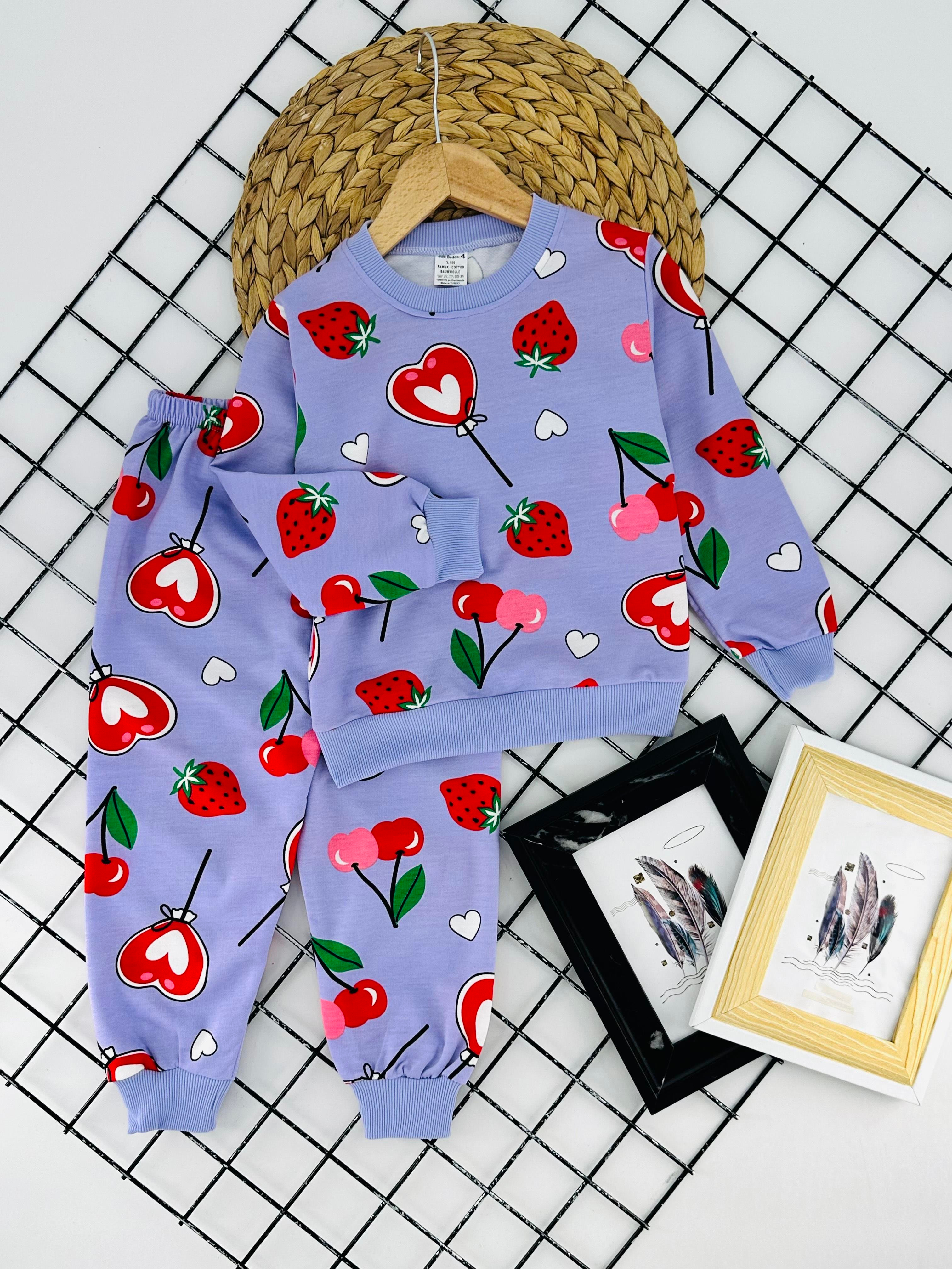 1000-37 Kalp Kiraz Baskılı Kız Çocuk Penye Pijama Takımı-LİLA