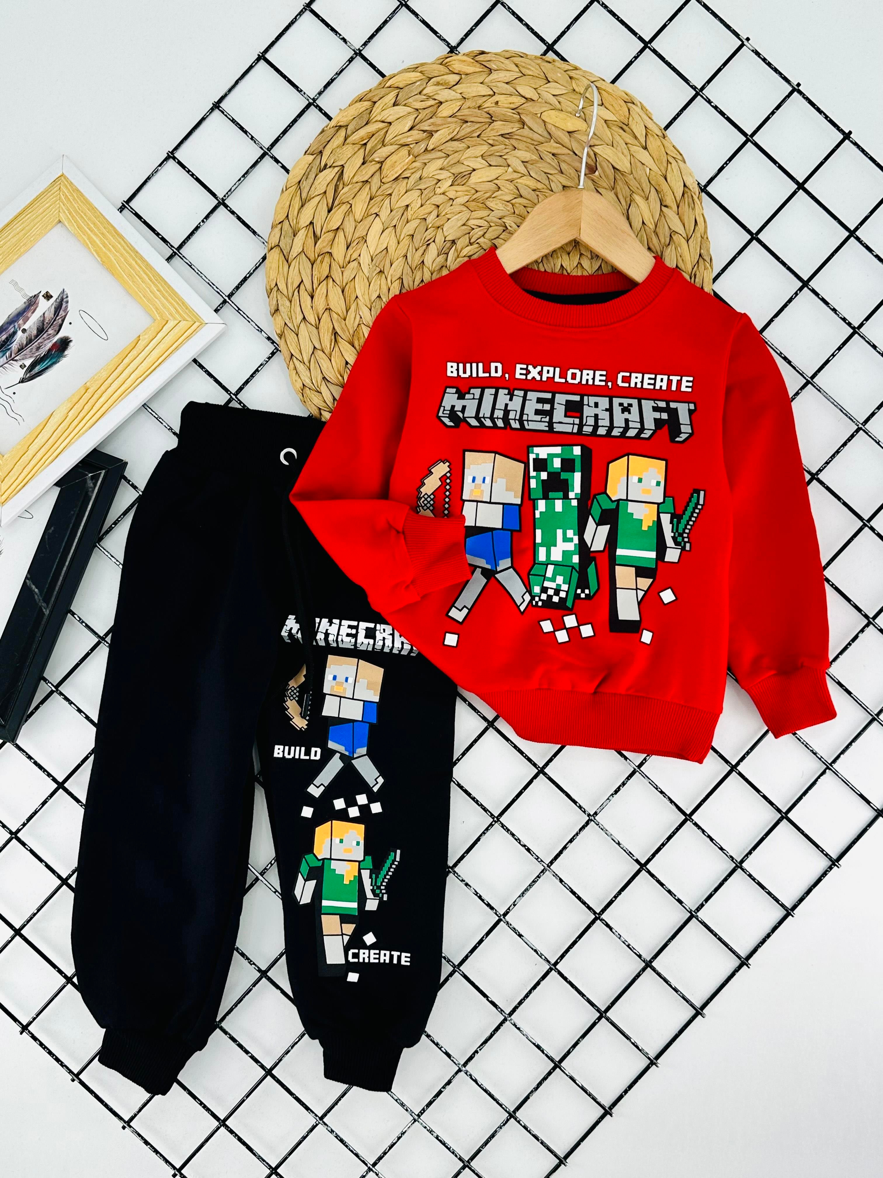 1032 Mncrft Baskılı İki İp Erkek Çocuk Takım-KIRMIZI