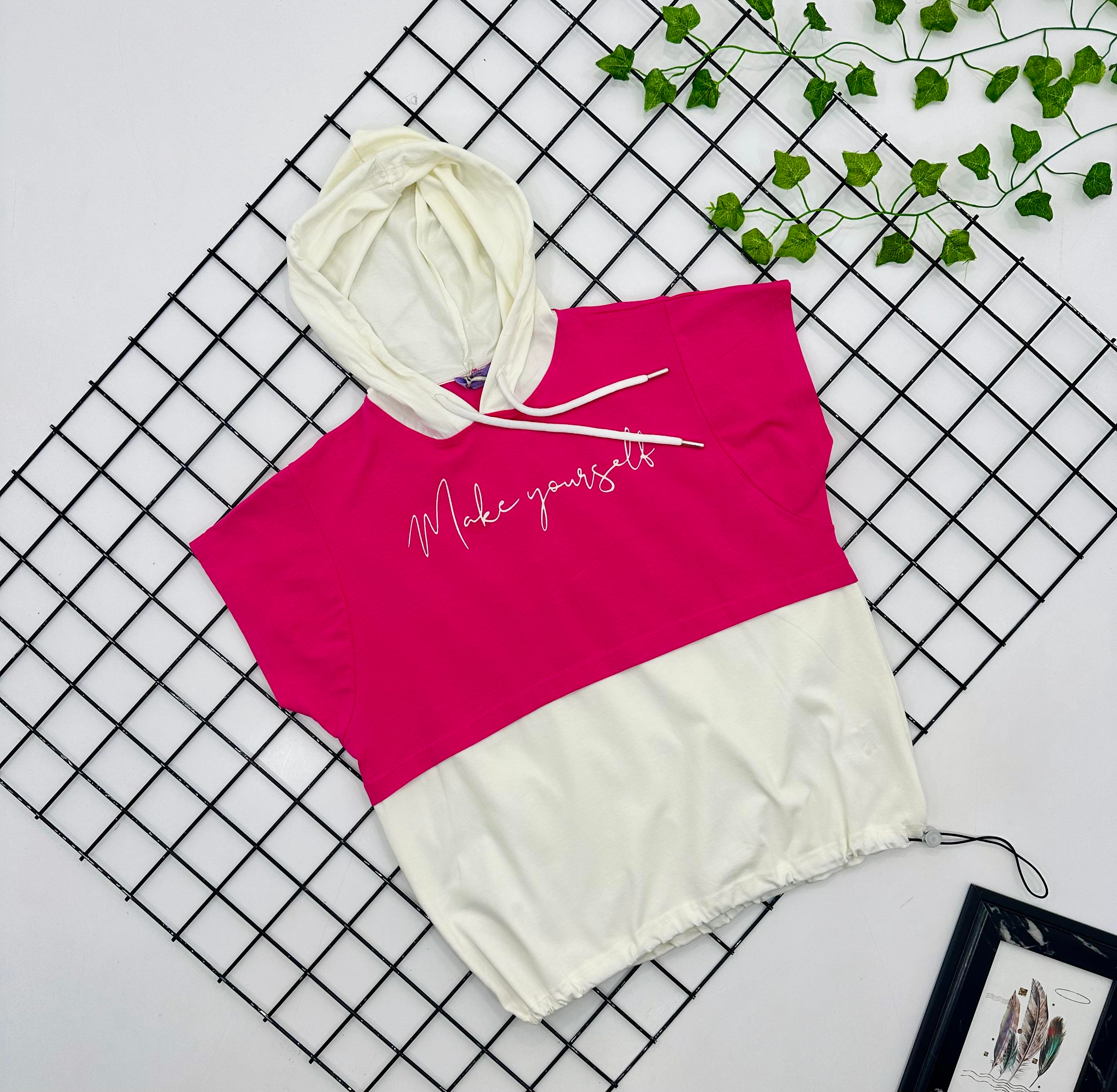 1055 Make Yourself Baskılı Kapşonlu Oversize Kız Çocuk Tişört-FUŞYA