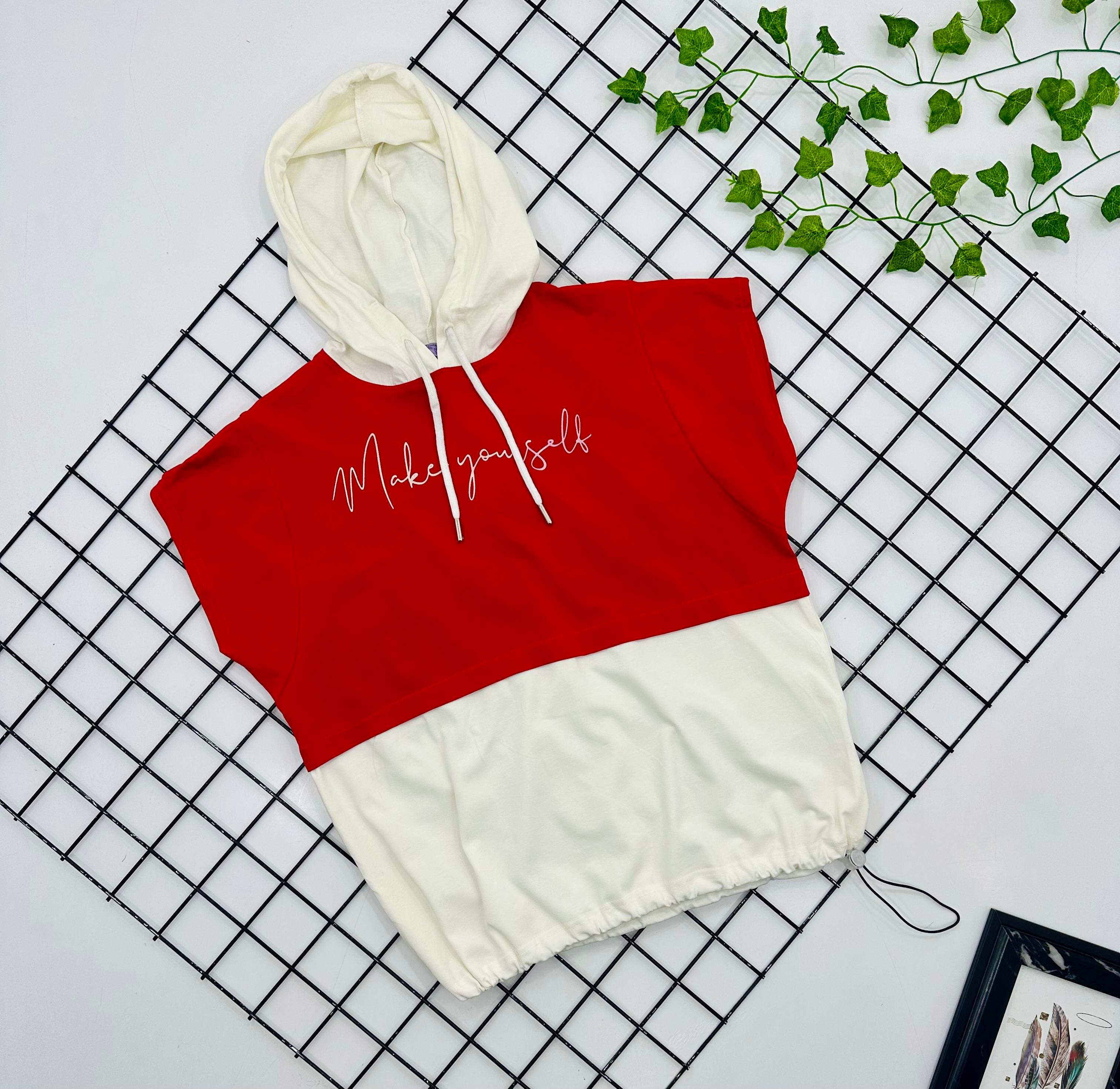 1055 Make Yourself Baskılı Kapşonlu Oversize Kız Çocuk Tişört-KIRMIZI