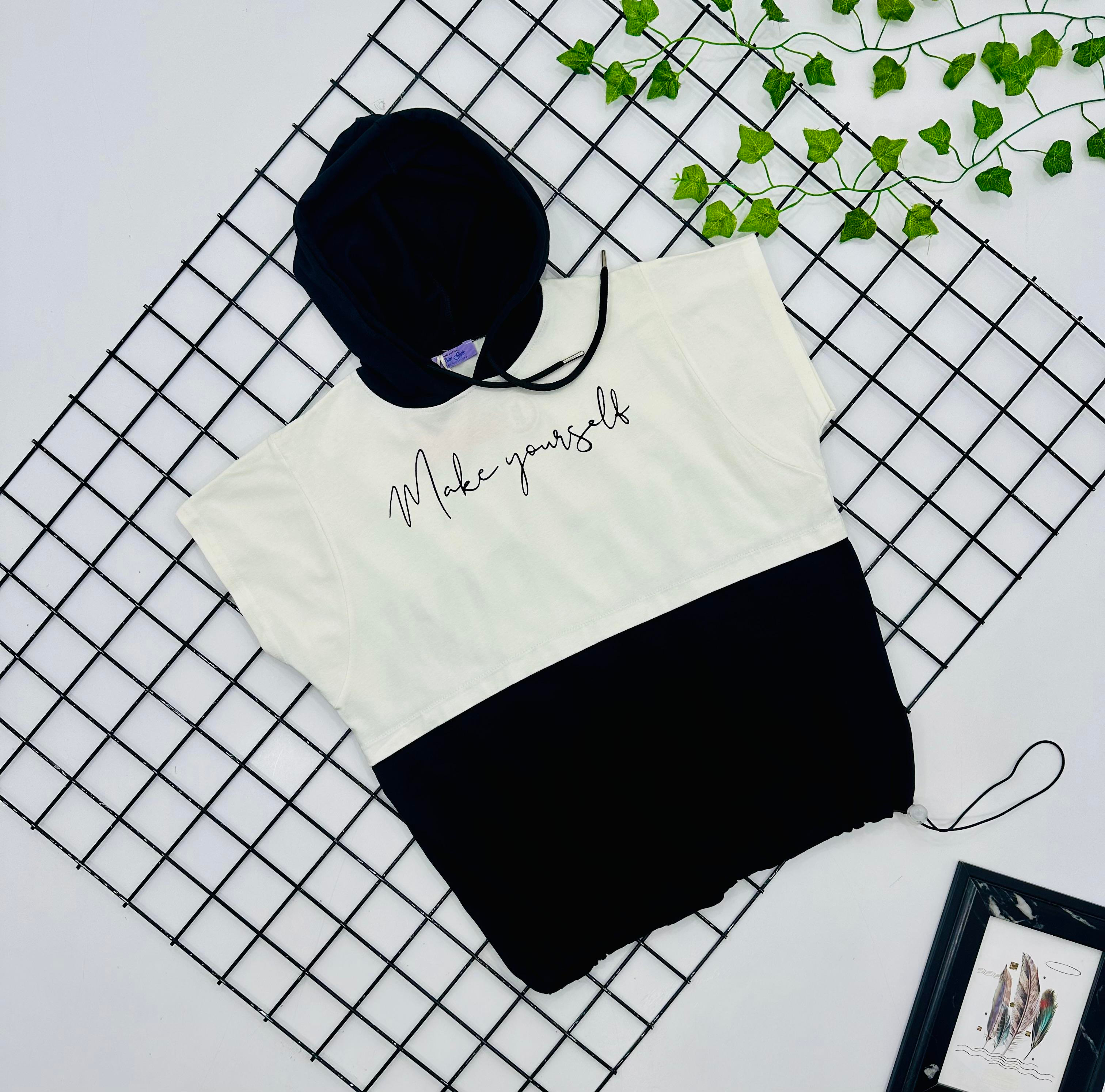 1055 Make Yourself Baskılı Kapşonlu Oversize Kız Çocuk Tişört-KREM