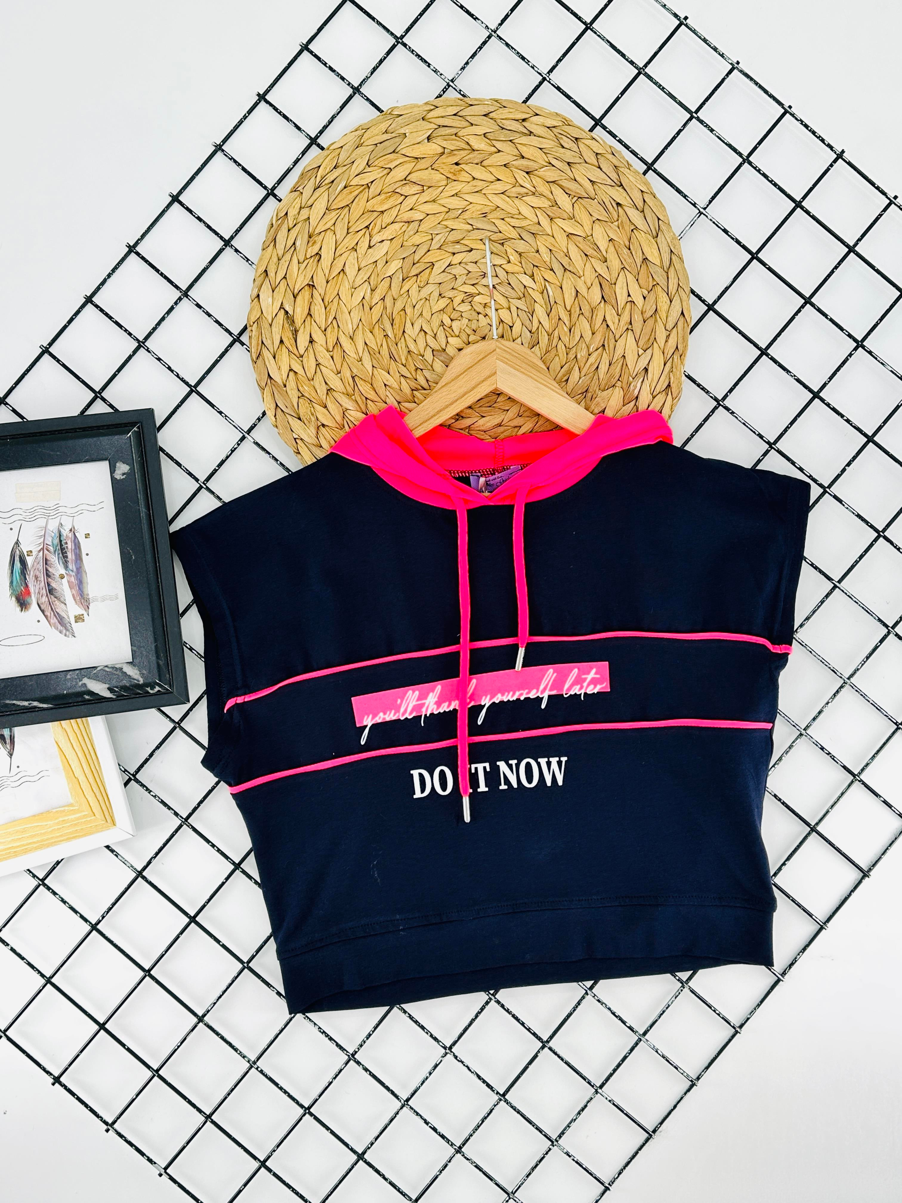 1057 Do It Now Baskılı Kapşonlu Kız Çocuk Krop Tişört-LACİVERT