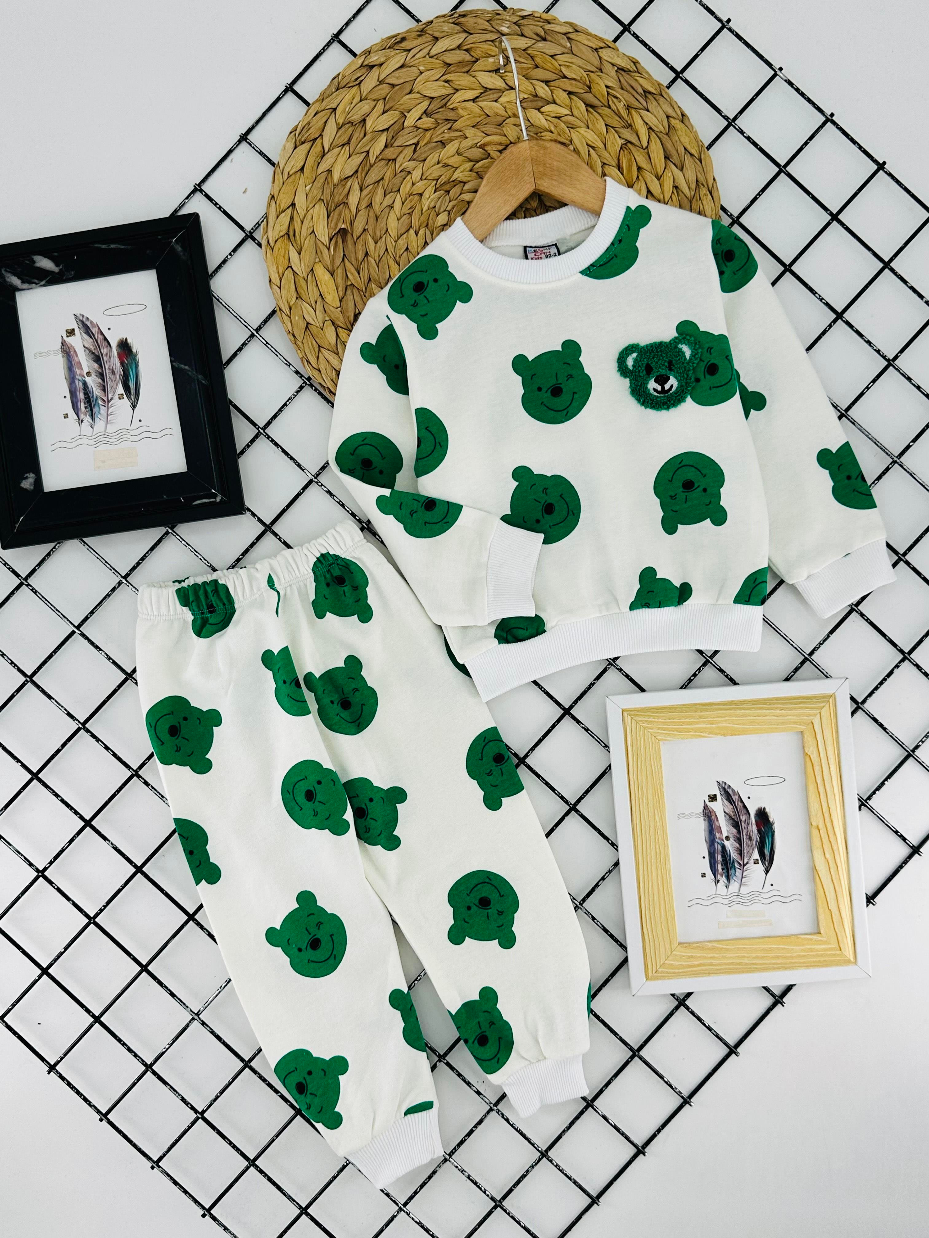 1108 Gülen Ayıcık Baskılı İçi Şardonlu Erkek Çocuk Penye Takım-YEŞİL