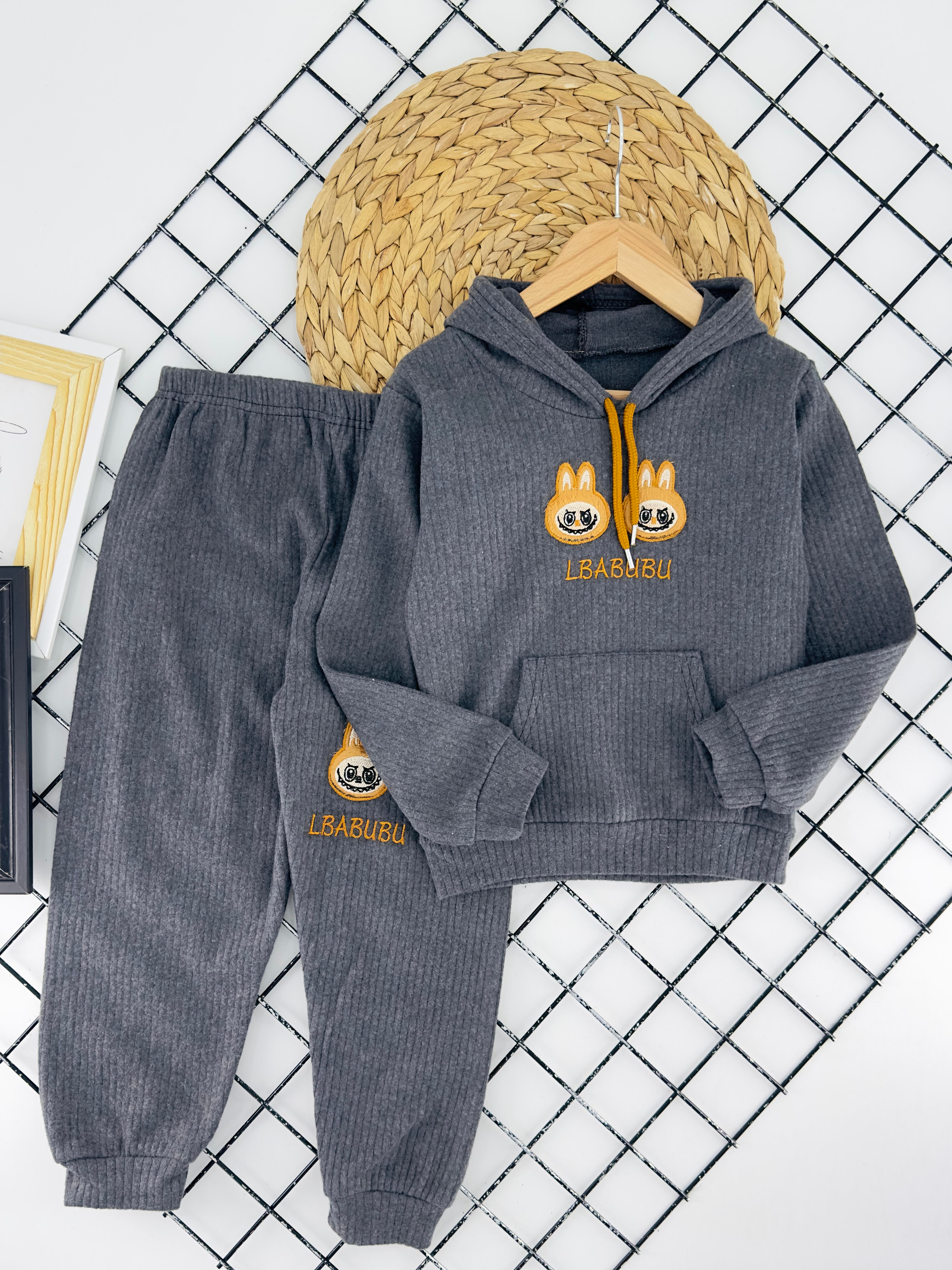 1600-1 Çift Lbb Nakışlı Kız Çocuk Fitilli Kumaş Kapşonlu Takım-ANTRASİT