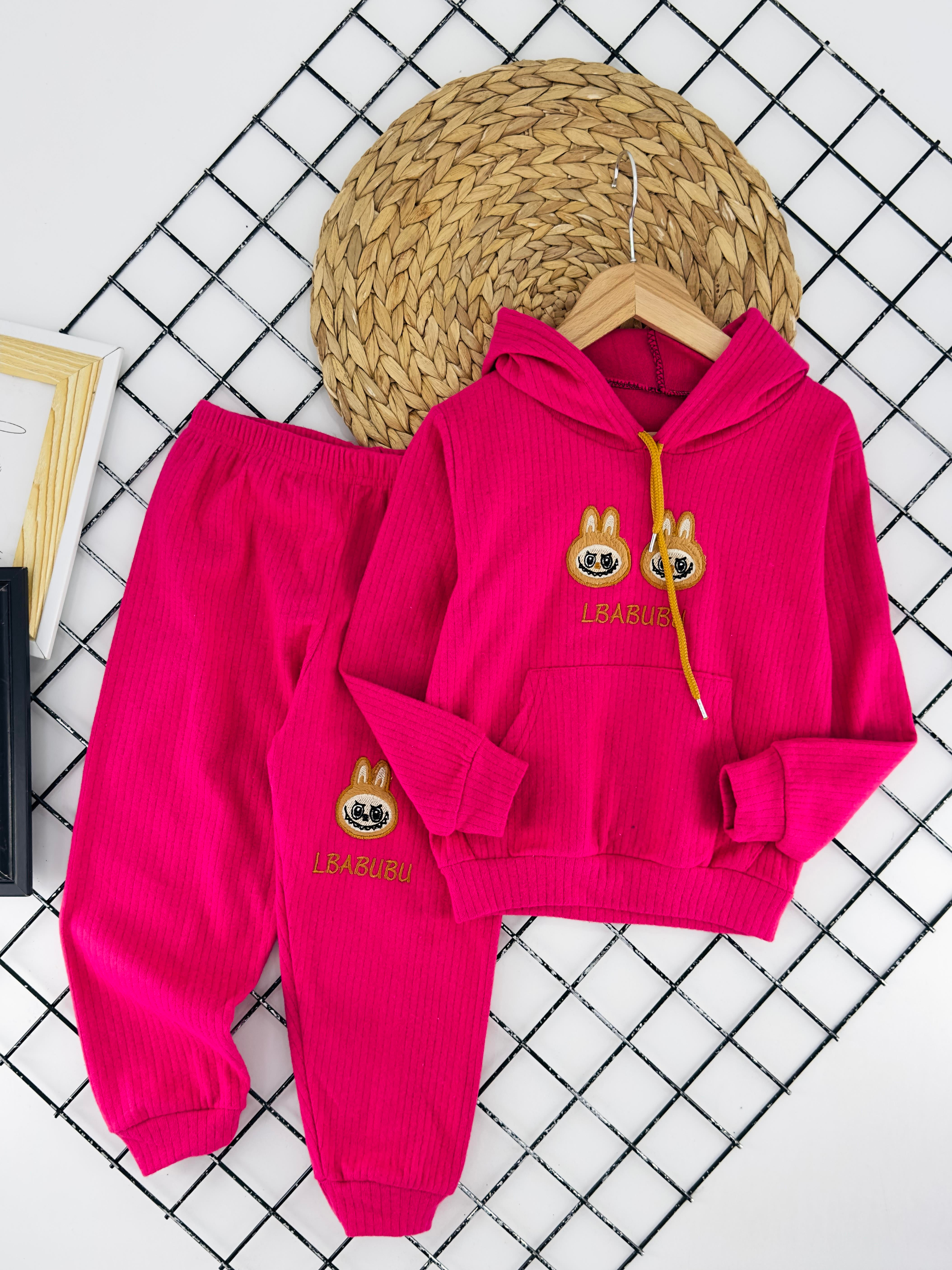 1600-1 Çift Lbb Nakışlı Kız Çocuk Fitilli Kumaş Kapşonlu Takım-FUŞYA