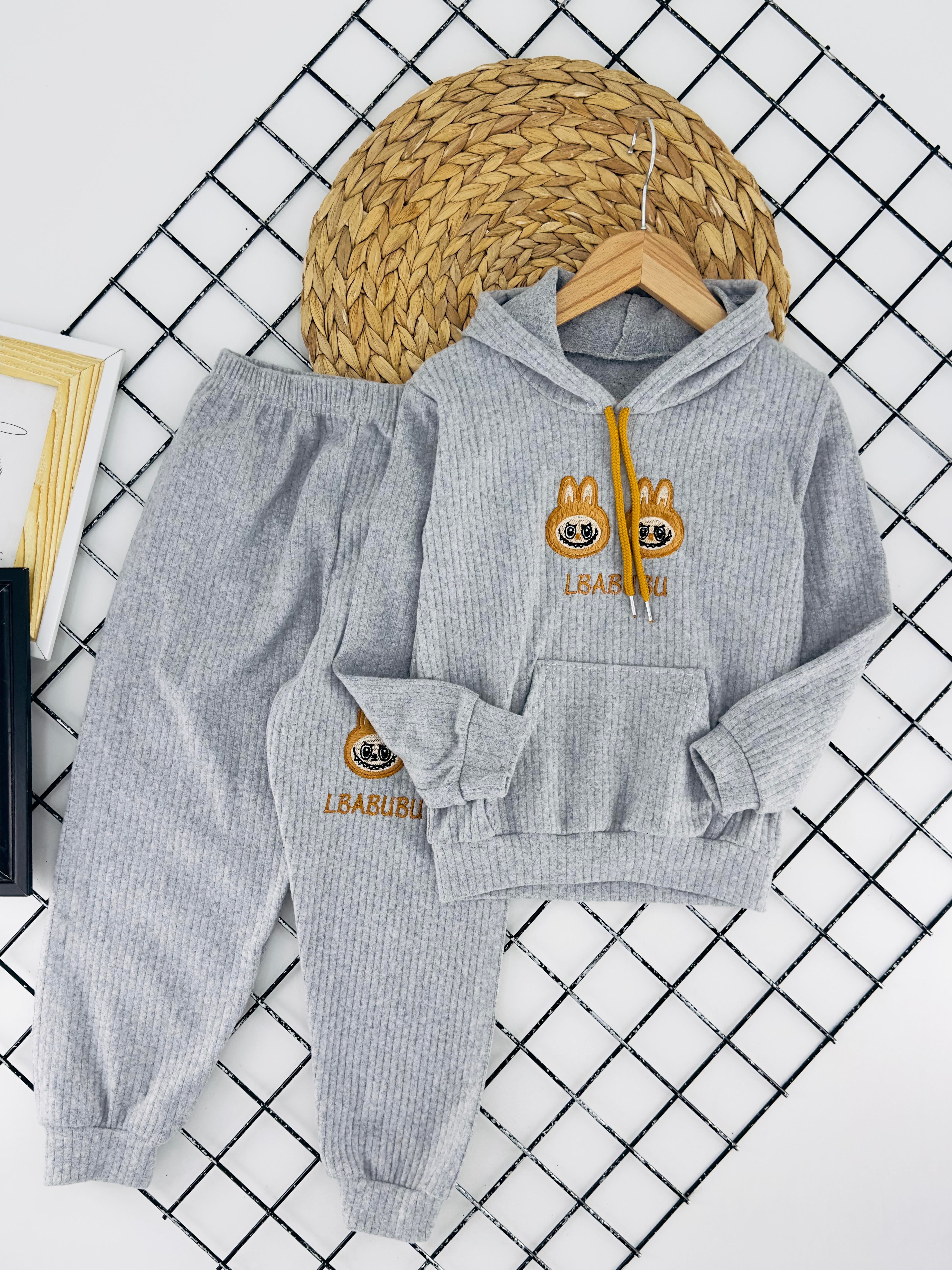 1600-1 Çift Lbb Nakışlı Kız Çocuk Fitilli Kumaş Kapşonlu Takım-GRİ