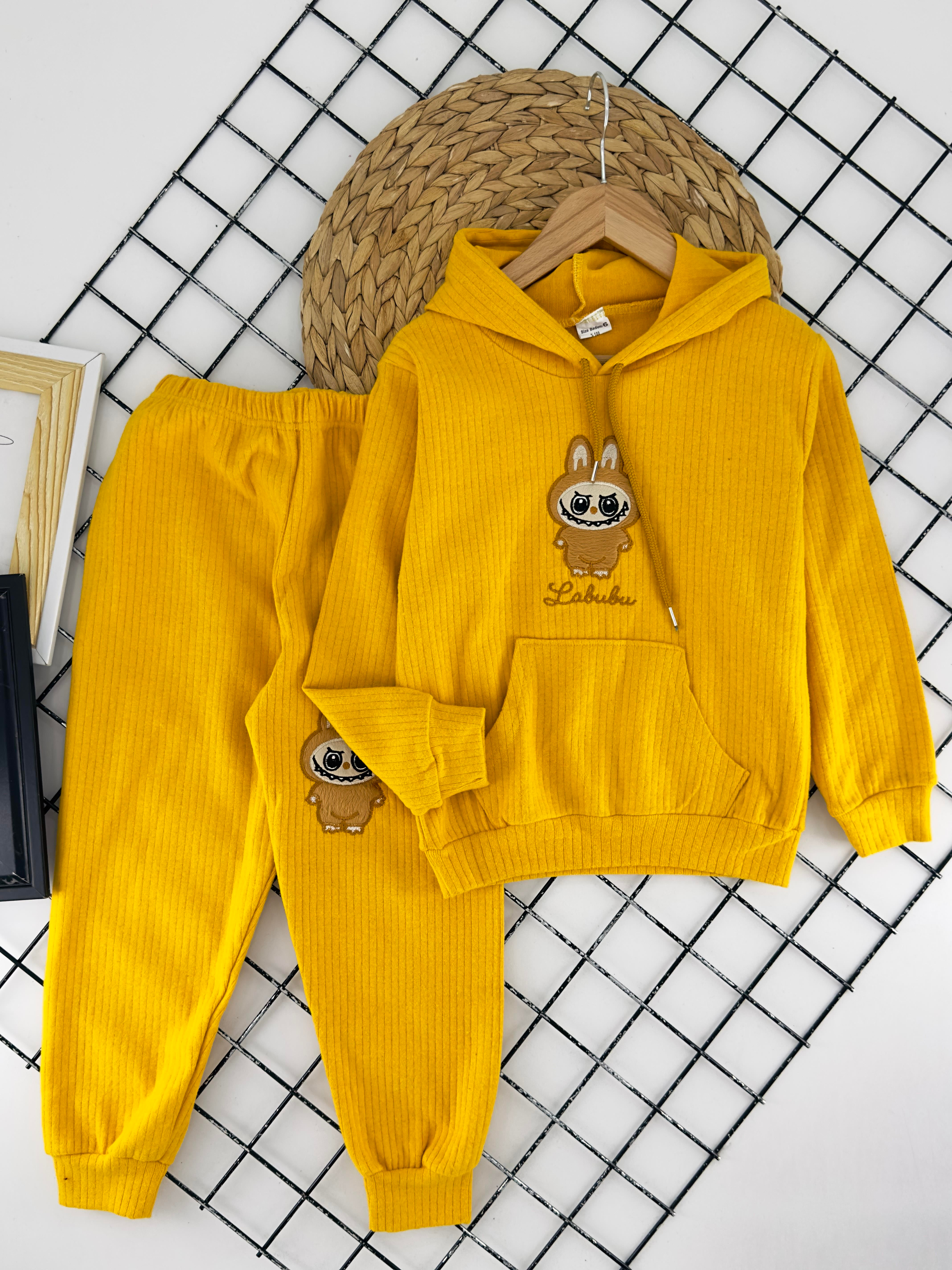 1600-2 Tek Lbb Nakışlı Kız Çocuk Fitilli Kumaş Kapşonlu Takım-SARI