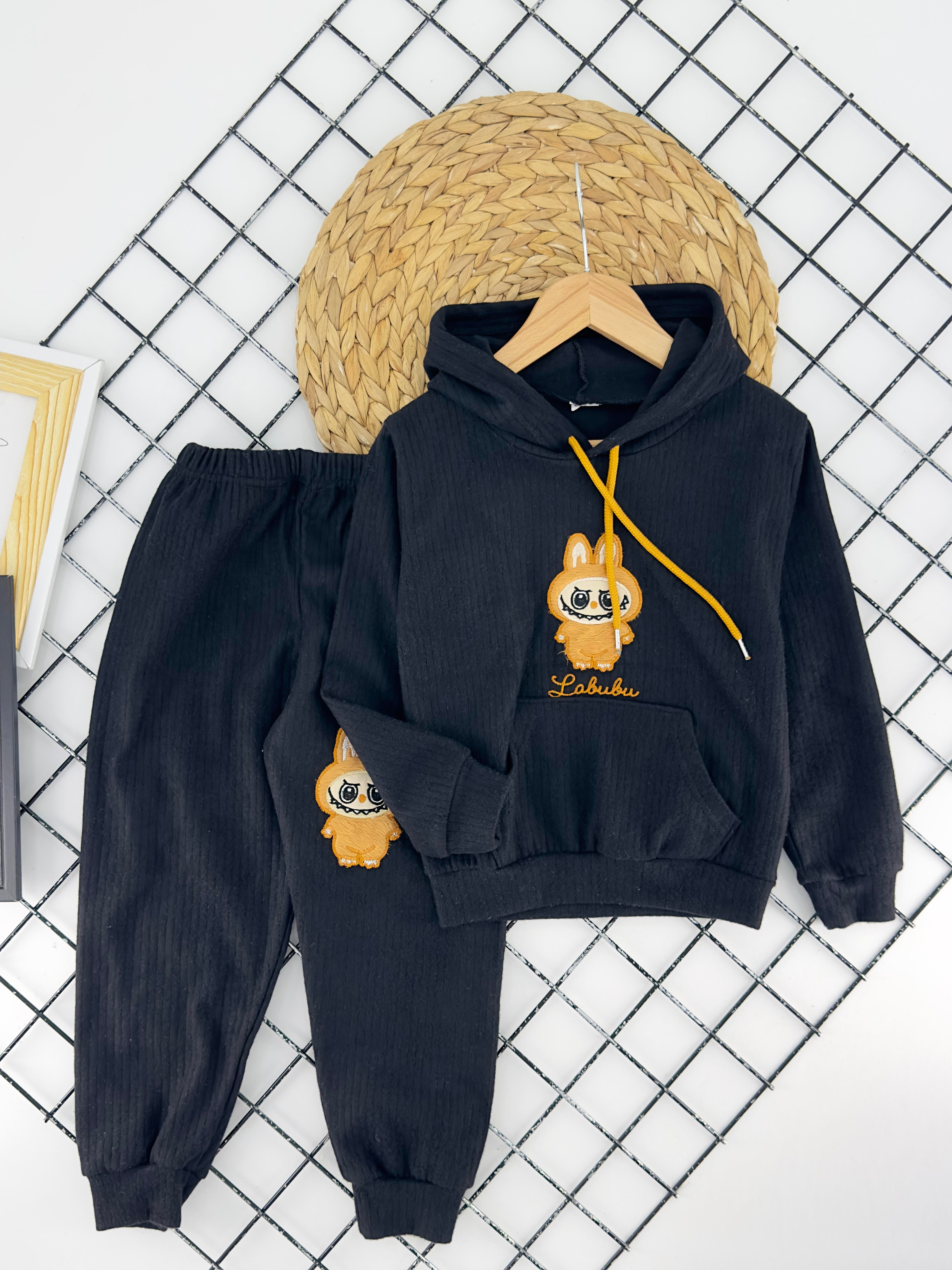1600-2 Tek Lbb Nakışlı Kız Çocuk Fitilli Kumaş Kapşonlu Takım-SİYAH