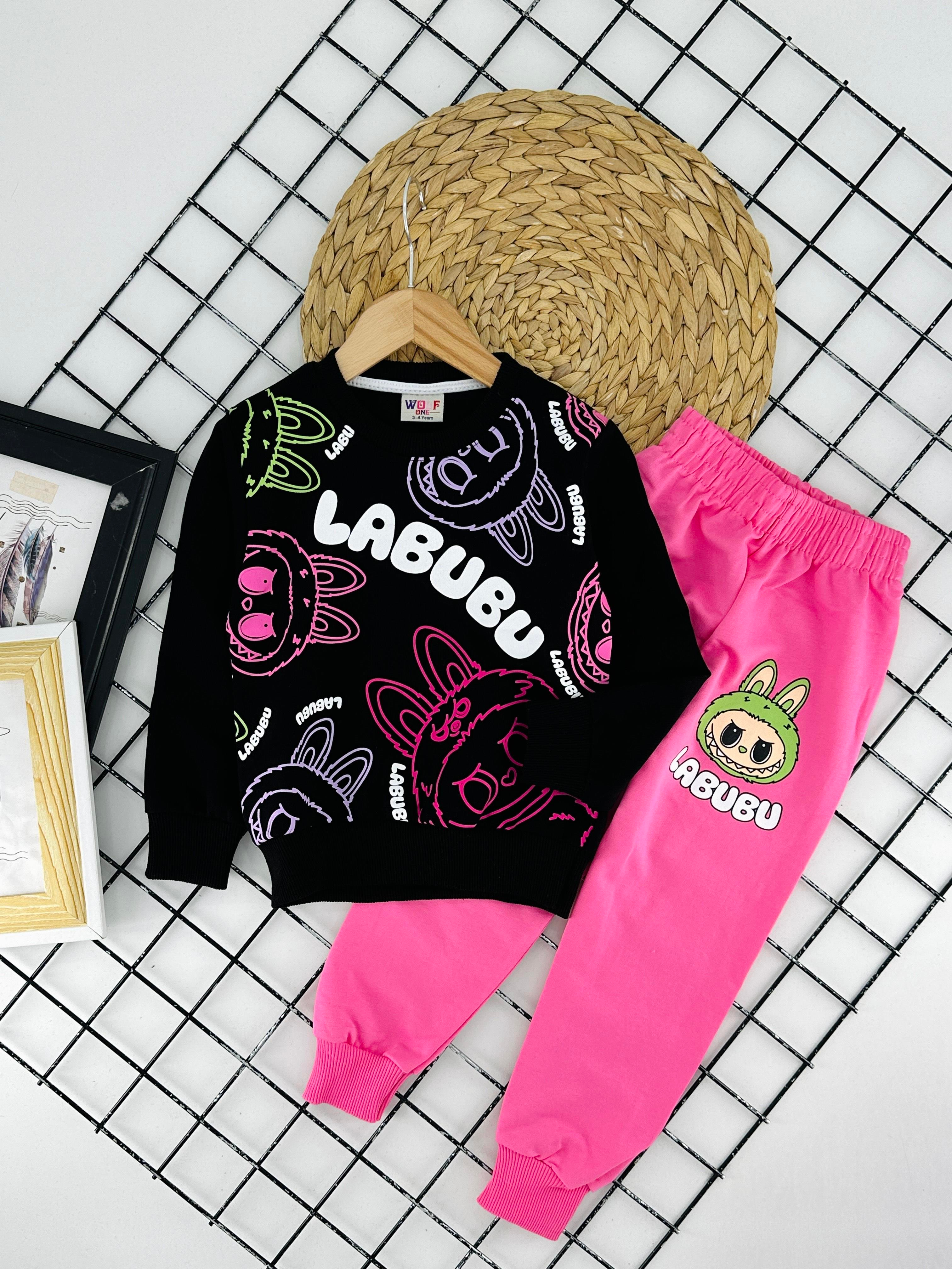 167-3 Çoklu Lbb Yazılı Baskılı Kız Çocuk İki İplik Penye Takım-PEMBE