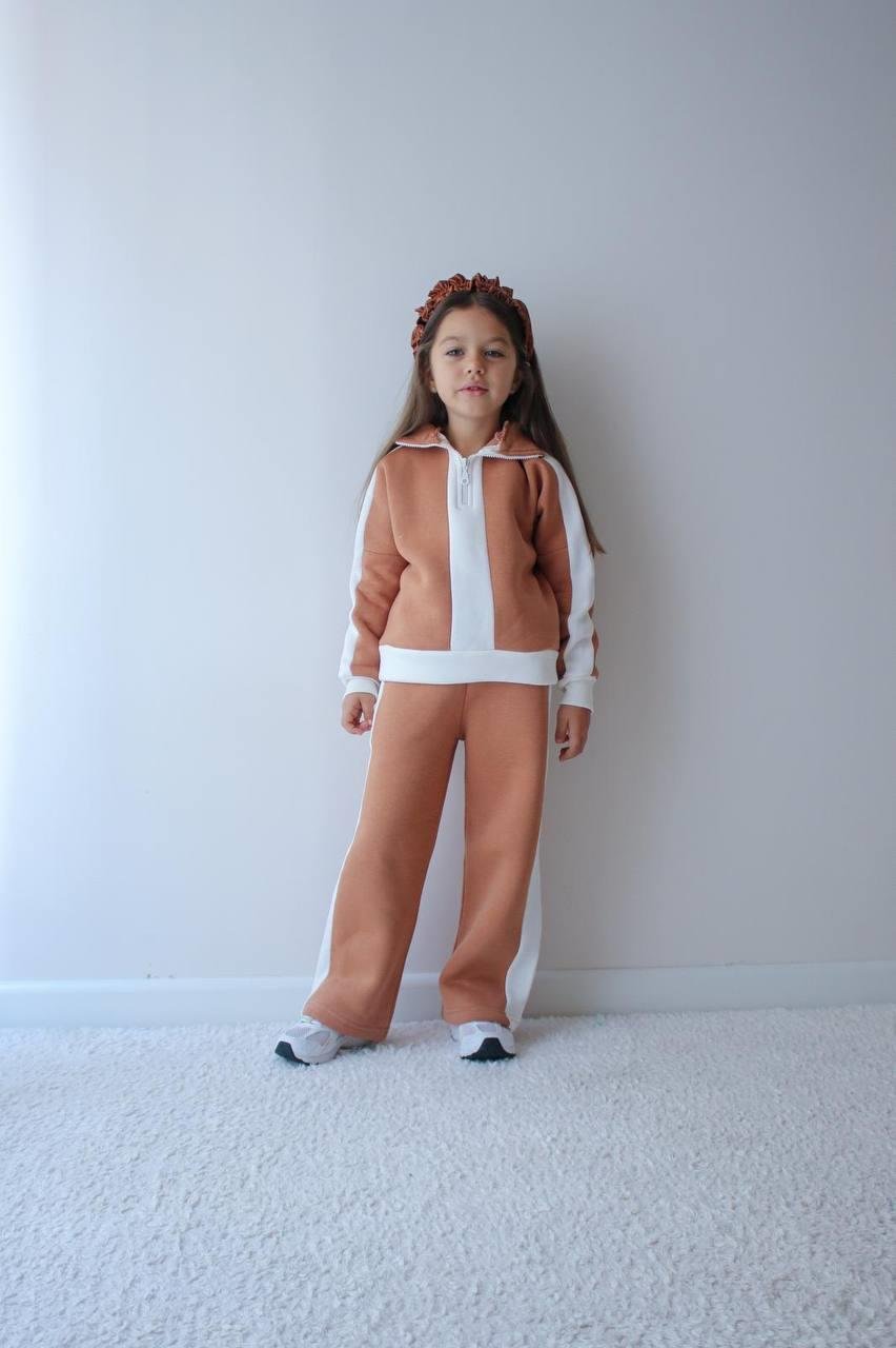 17210 Yakası Fermuarlı Üç İp Şardonlu Kız Çocuk Takım-KAHVE