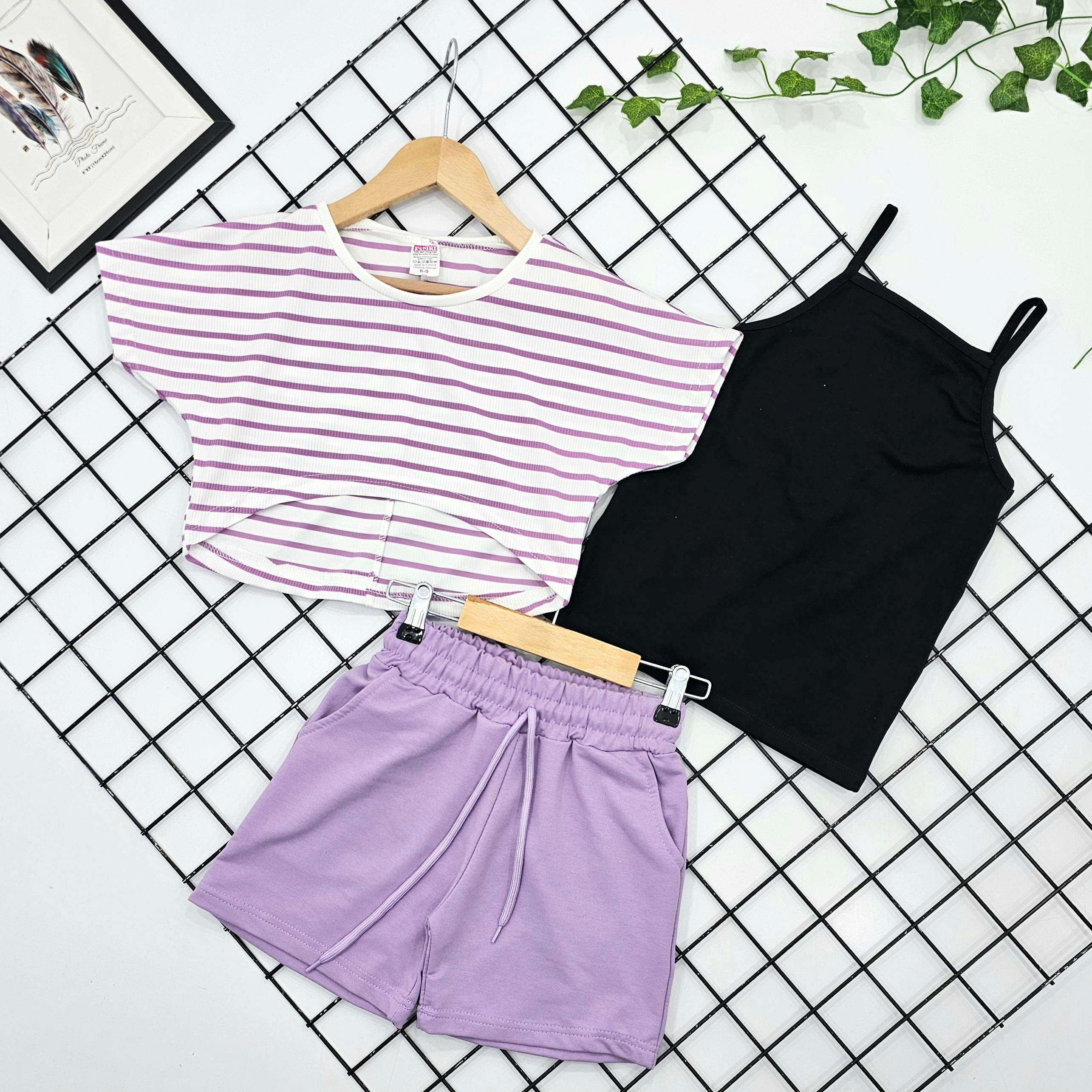 180-1 İp Askılı Badili Şortlu Krop Kız Çocuk 3 Lü Takım (8-12 Yaş)-LİLA