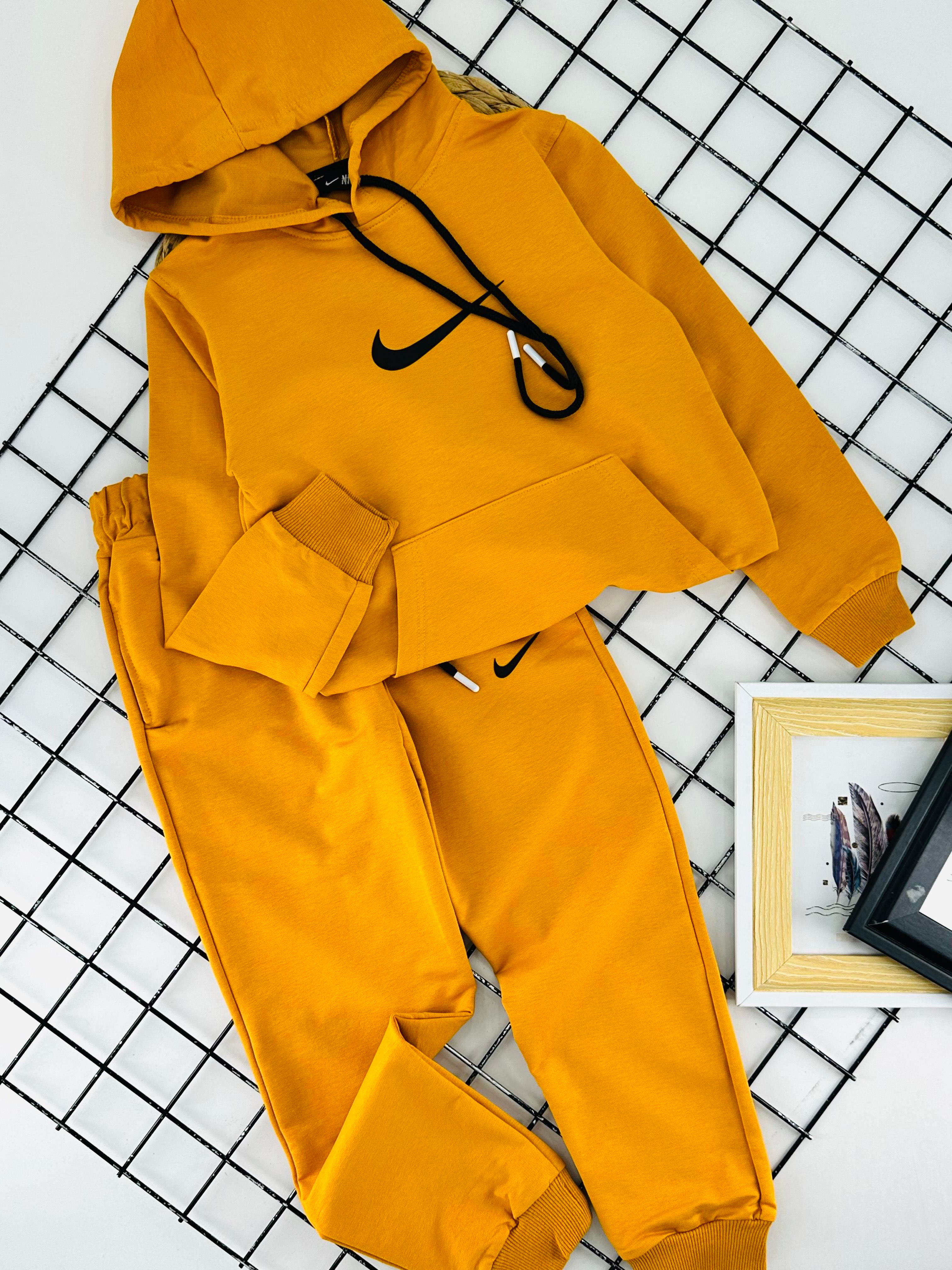 180-2 Nk Baskılı Kapşonlu Kanguru Cepli İki İplik Unısex Penye Eşofman Takımı-HARDAL