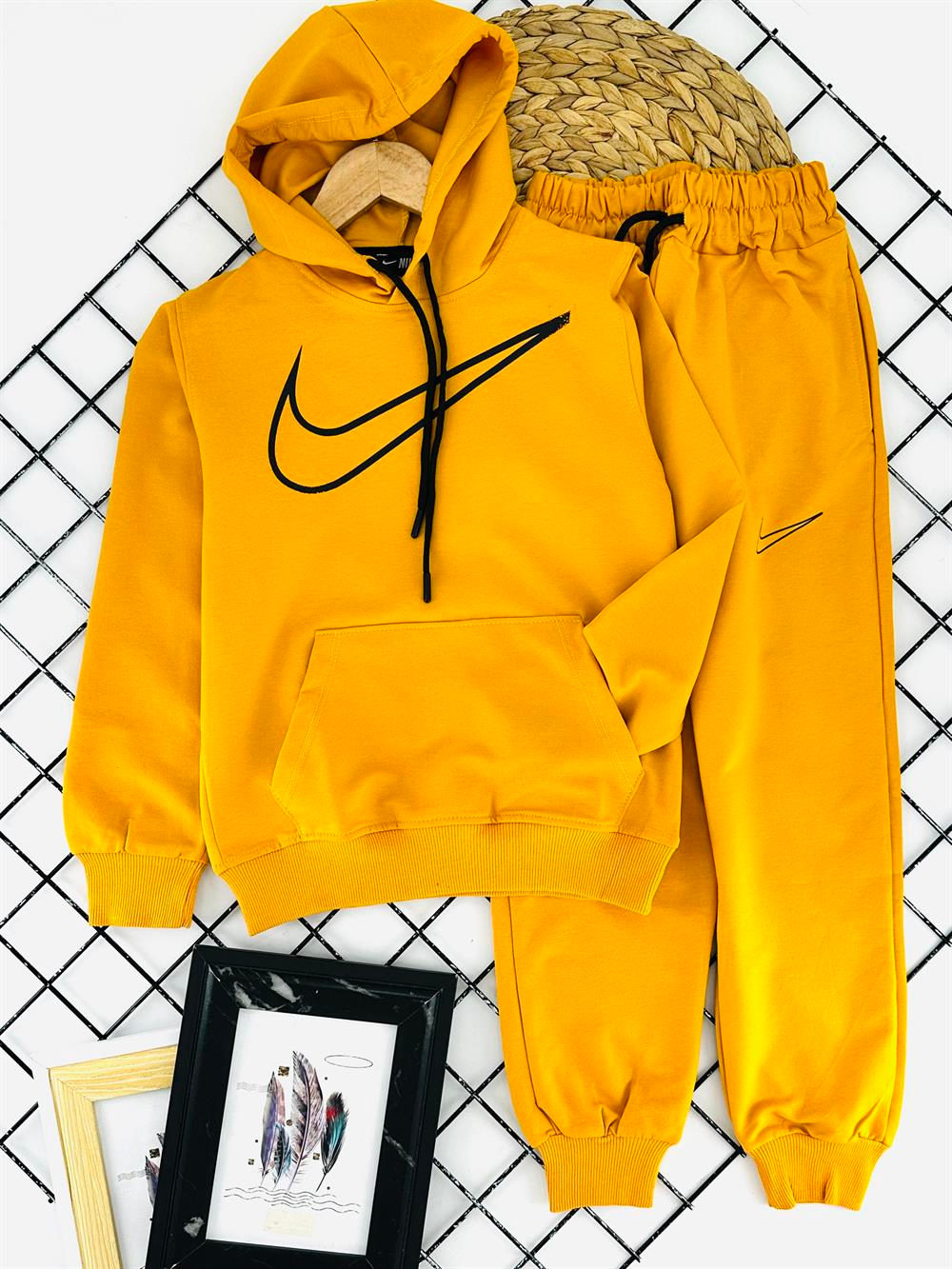180-6 Büyük Nk Baskılı Kanguru Cepli Kapşonlu Unısex İki İplik Penye Eşofman Takımı-HARDAL