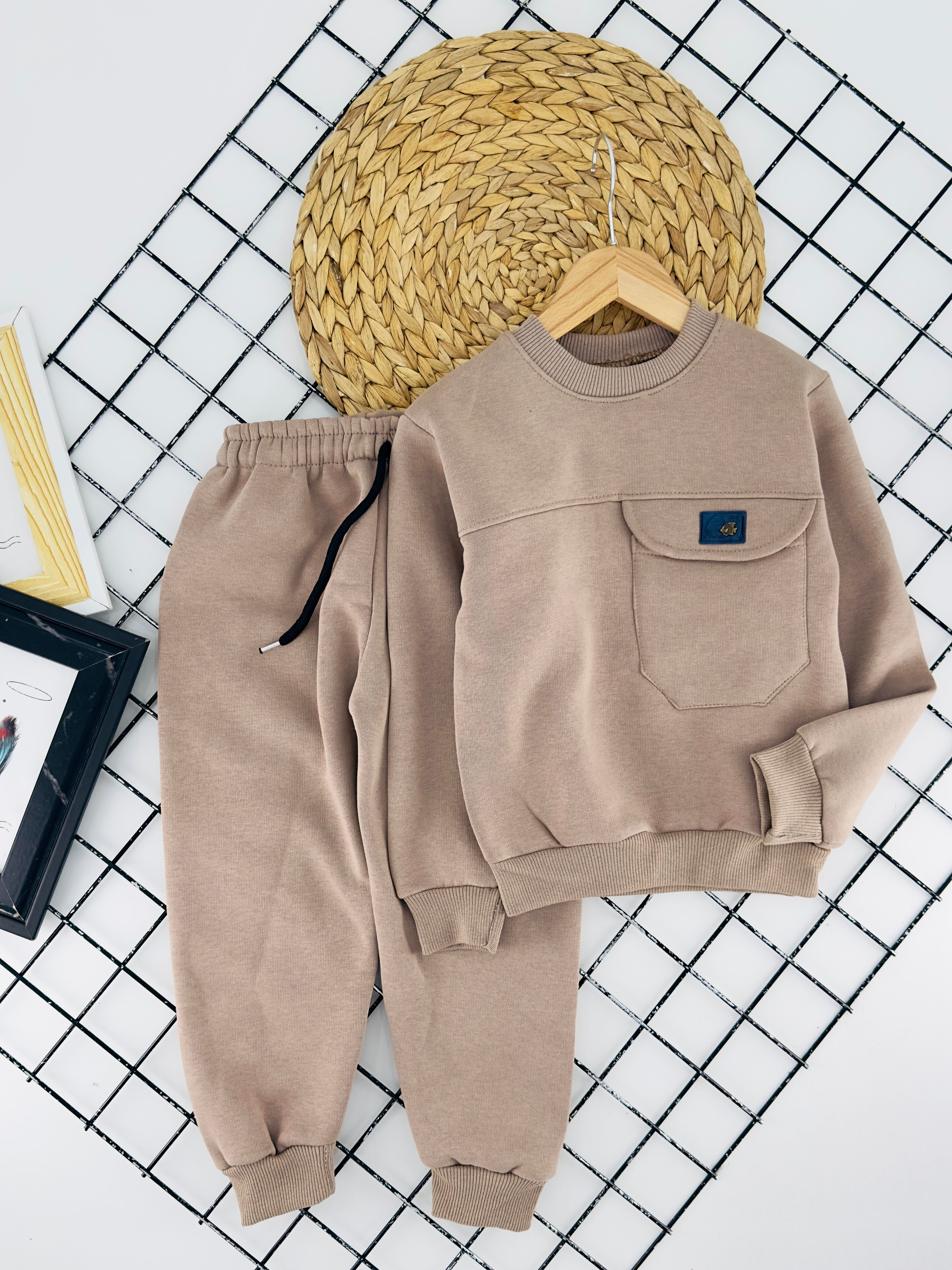 190-2 Cep Kapaklı Erkek Çocuk Üç İplik Şardonlu Takım-BEJ