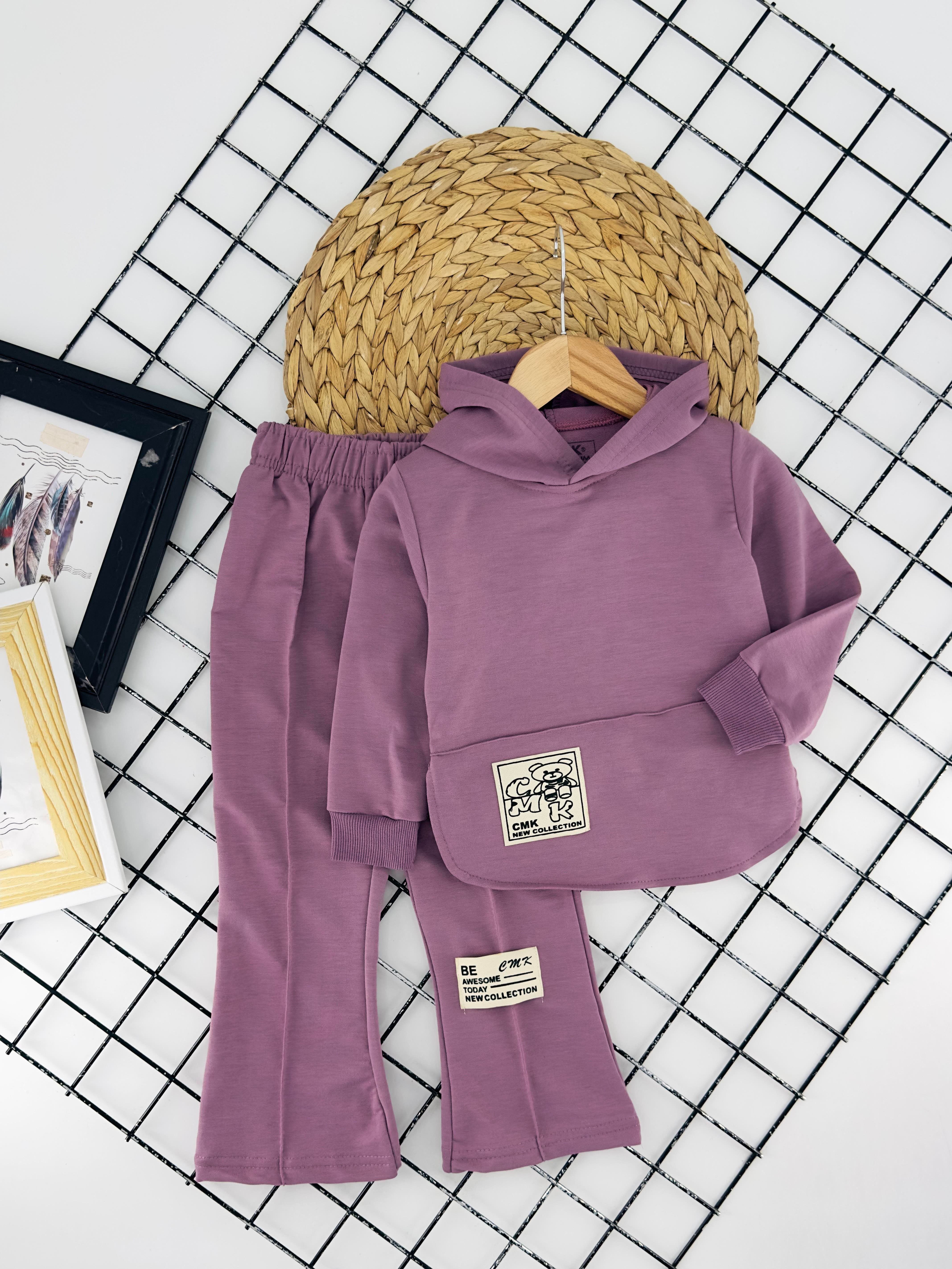 190000 Kapşonlu Ayıcık Baskılı Kız Çocuk İki İplik Penye Takım-MÜRDÜM