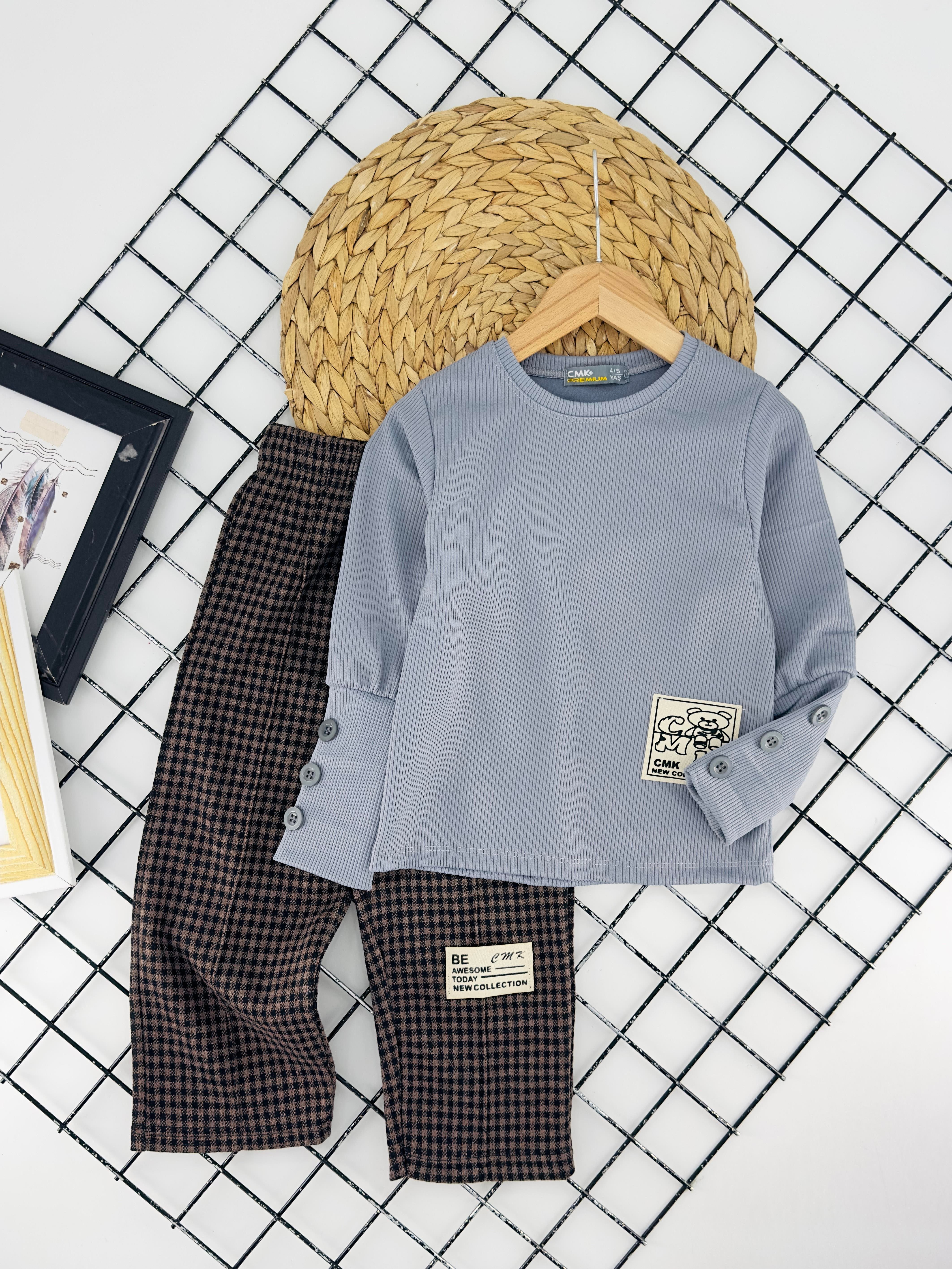 190050 Kolları Düğmeli Kız Çocuk İki İplik Penye Takım-KOYU GRİ