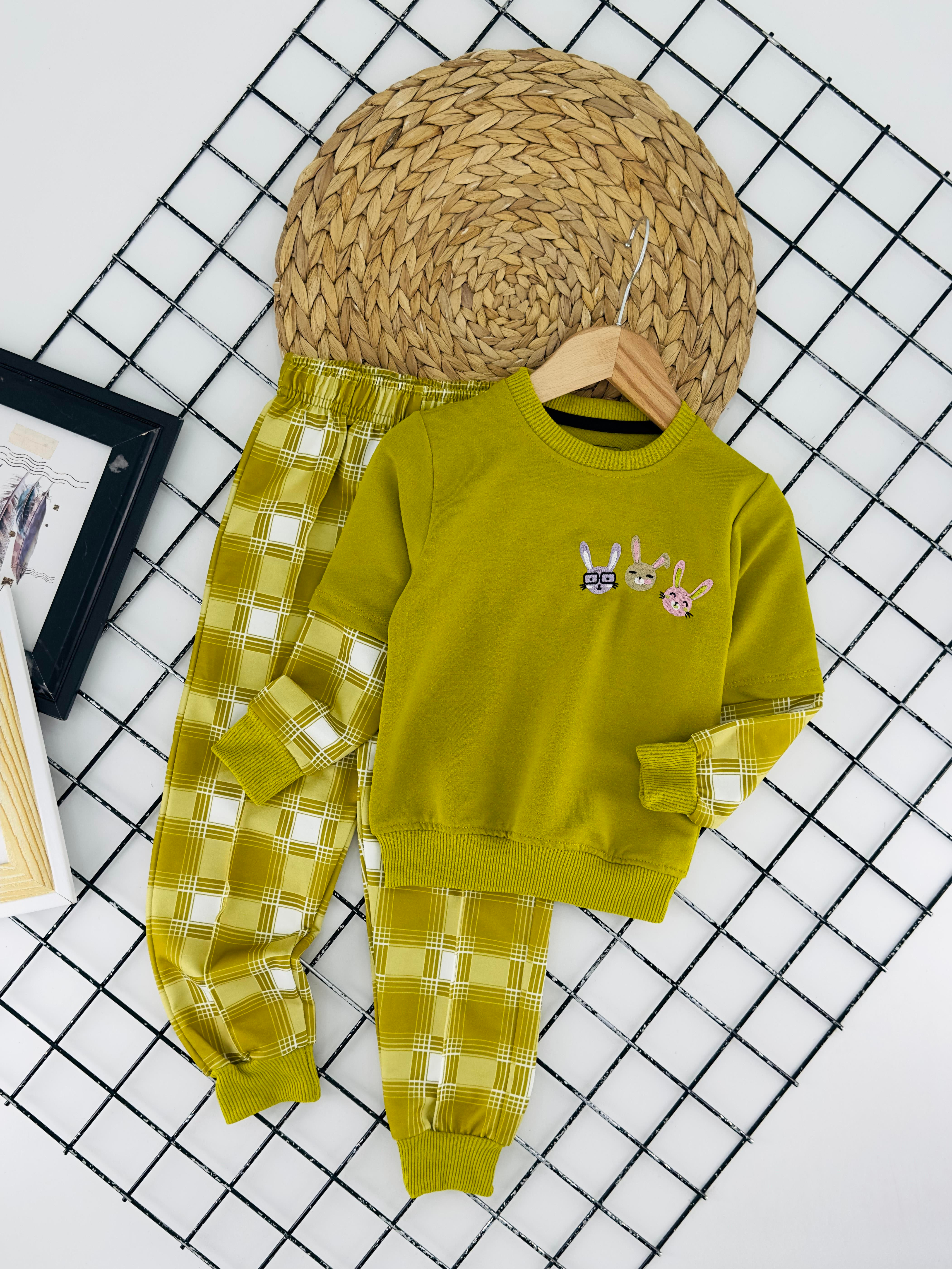 190055 Tavşan Baskılı Kız Çocuk İki İplik Penye Takım-FISTIK YEŞİLİ