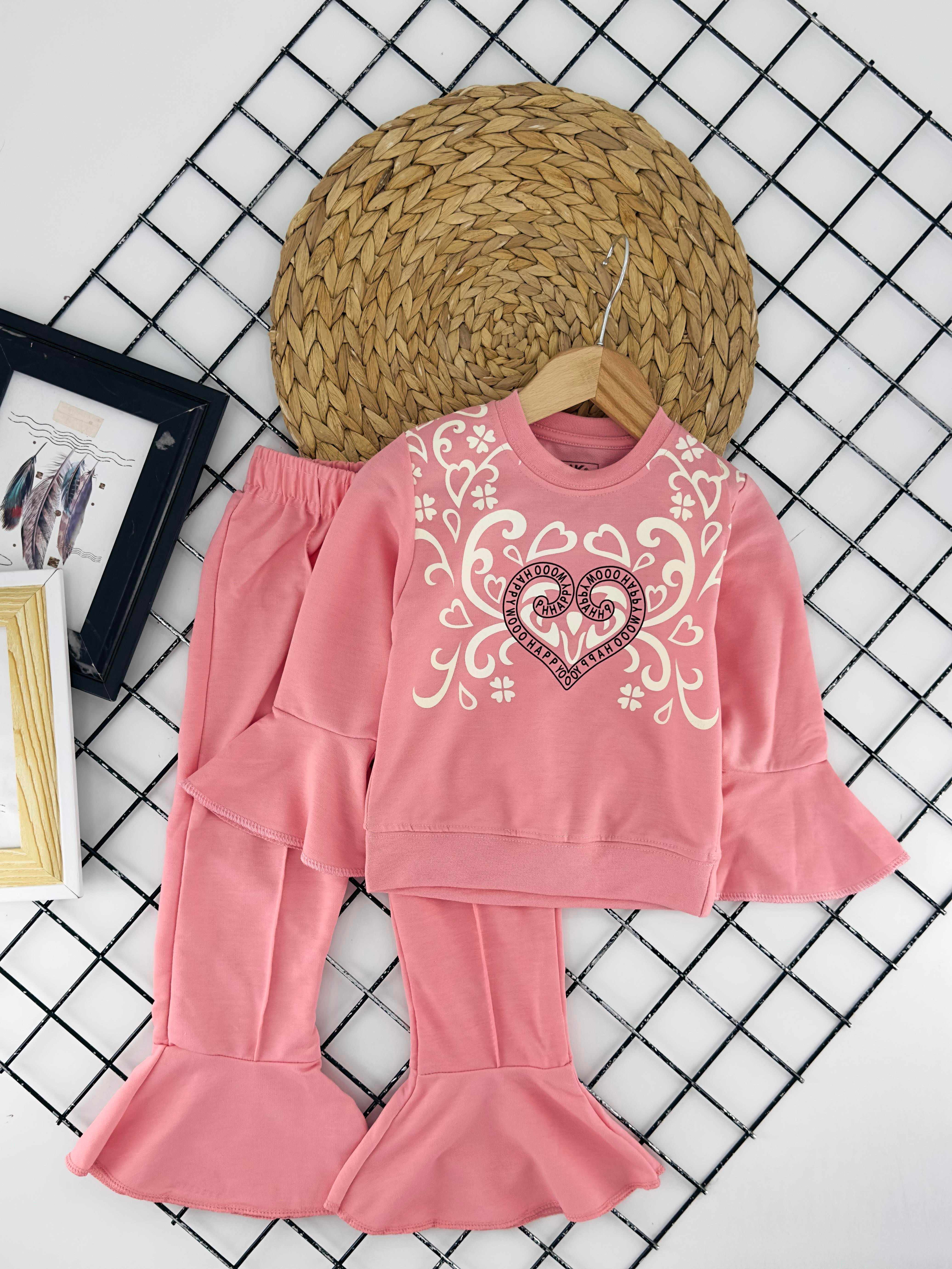 190065 Kalp Çiçek Baskılı Kız Çocuk İki İplik Penye Takım-PEMBE