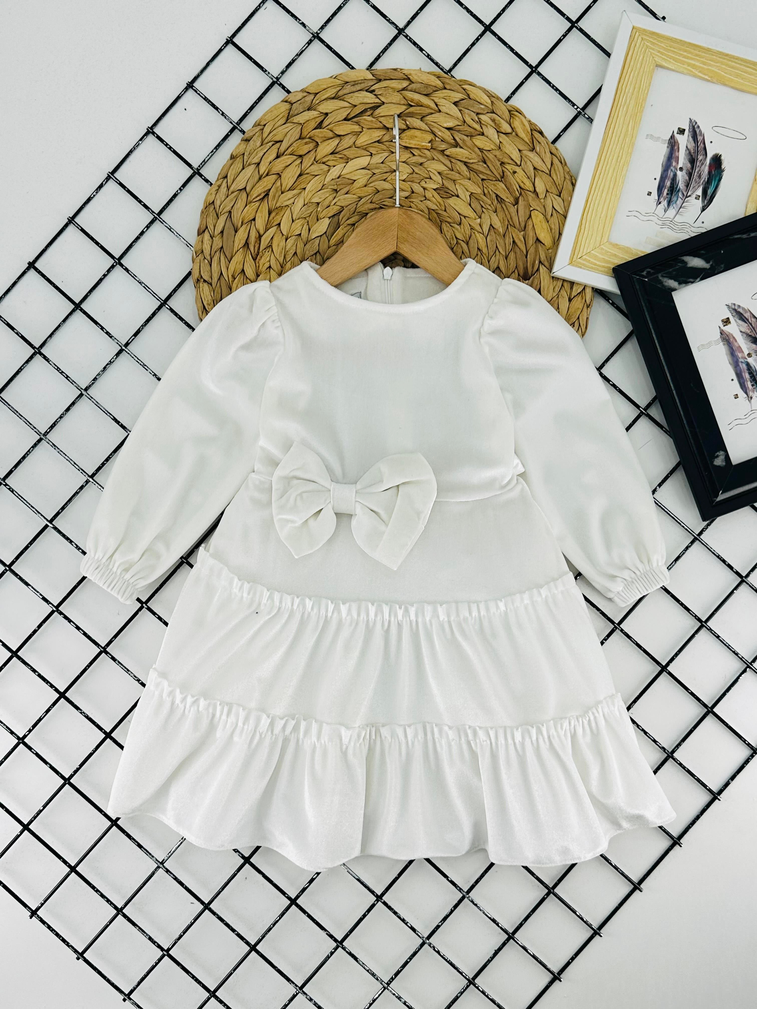 2005 Kol Ucu Lastikli Önü Fiyonklu Altı Fırfırlı Kadife Elbise-BEYAZ