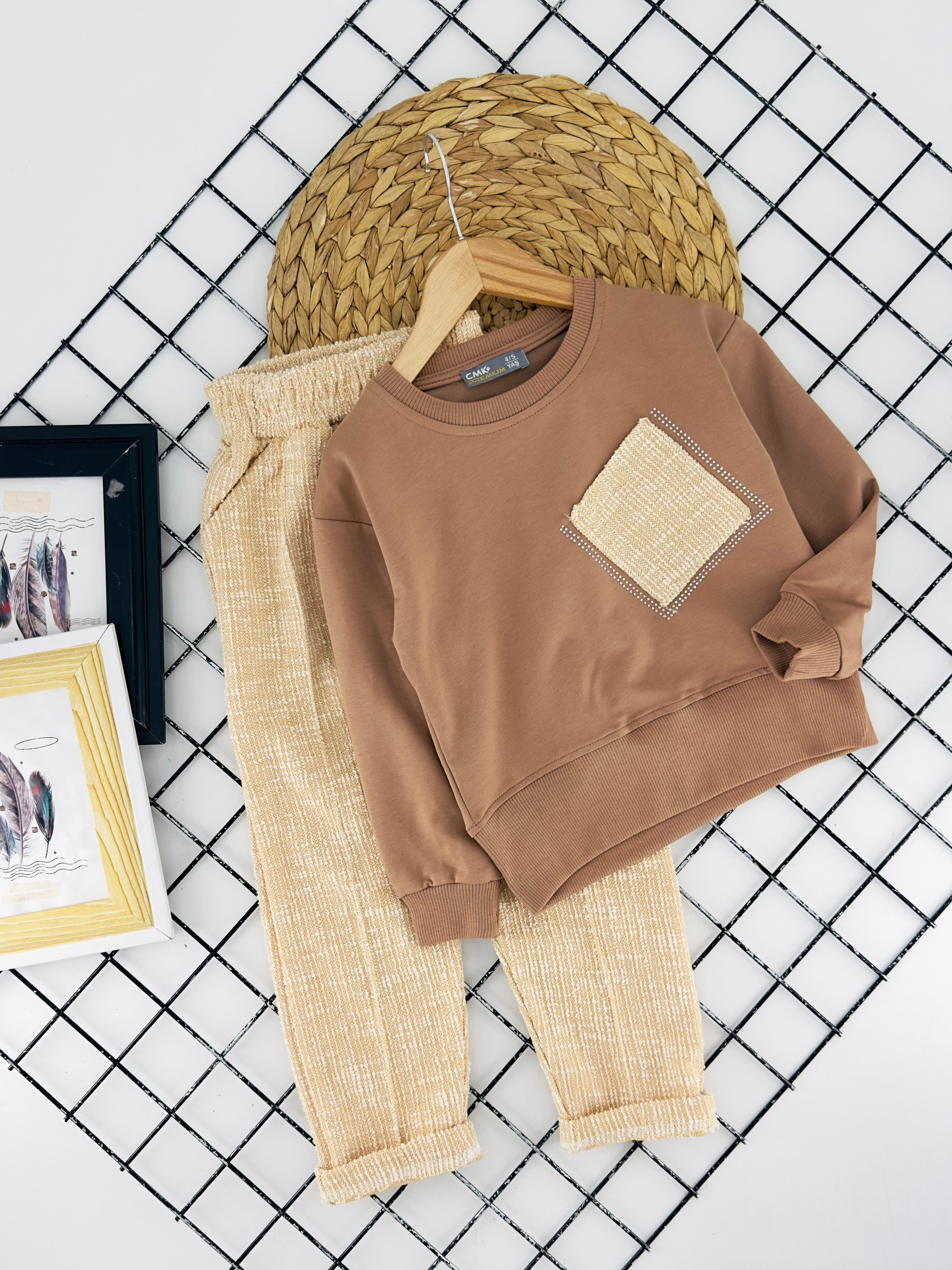 200750 Yan Cep Detaylı Boncuklu Kız Çocuk Penye Takım-BEJ