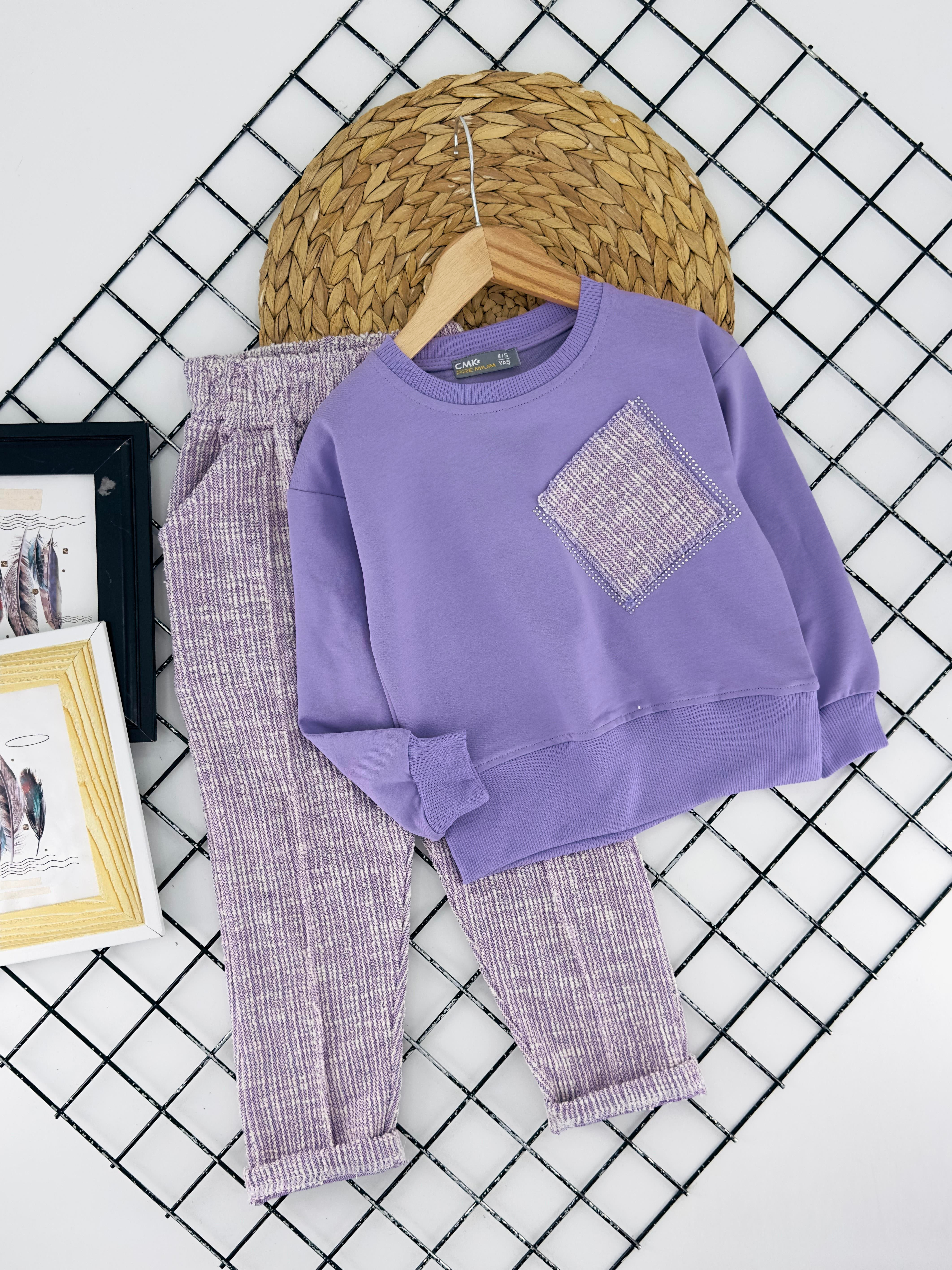 200750 Yan Cep Detaylı Boncuklu Kız Çocuk Penye Takım-LİLA